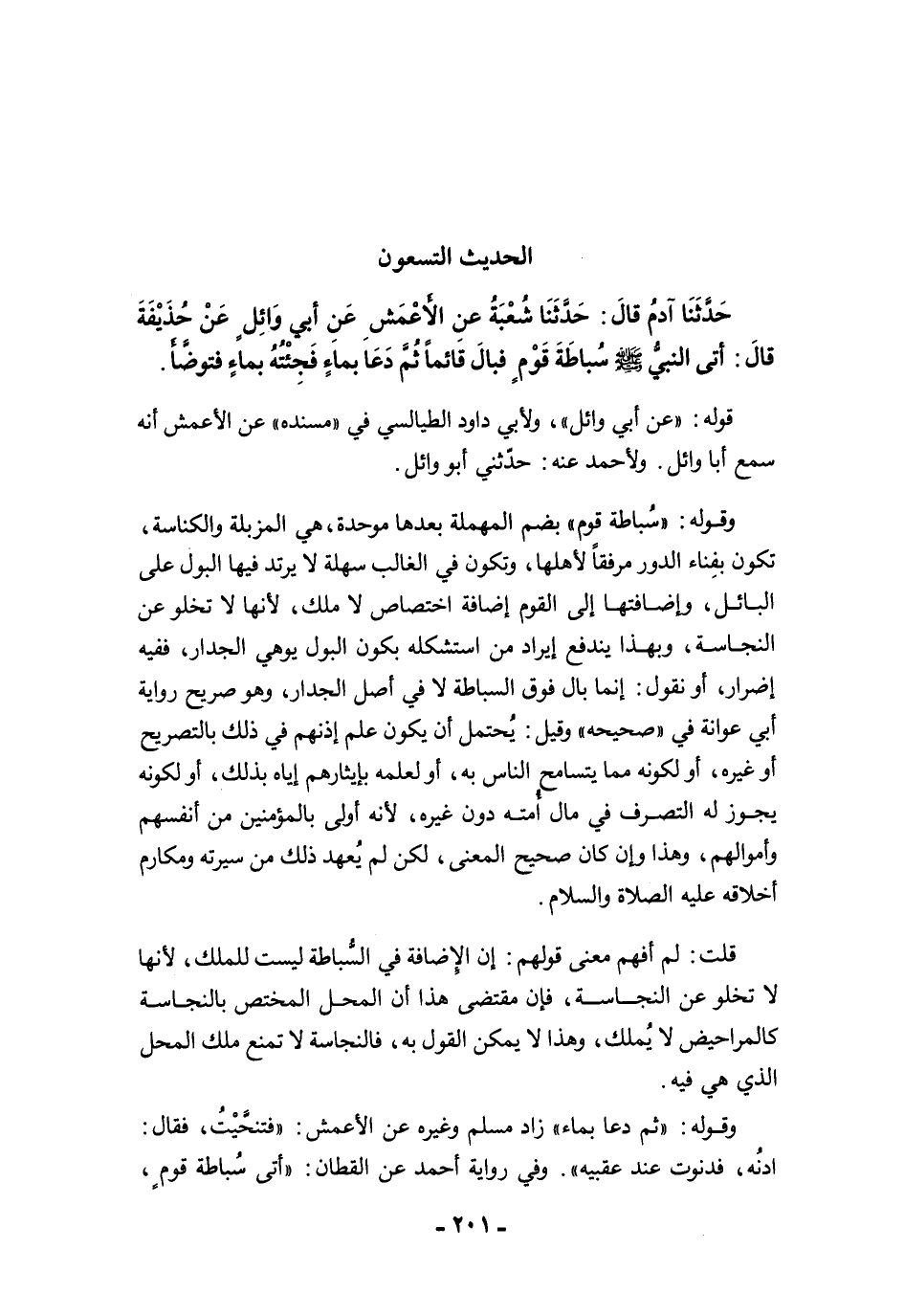 وقوله: "سُباطة قوم" بضم المهملة بعدها موحدة، هي المزبلة والكناسة، تكون بفِناء الدور مرفقًا لأهلها، وتكون في الغالب سهلة لا يرتد فيها البول على البائل، وإضافتها إلى القوم إضافة اختصاص لا ملك؛ لأنها لا تخلو عن النجاسة، وبهذا يندفع إيراد من استشكله يكون البول يوهي الجدار، ففيه إضرار، أو نقول: إنما بال فوق السباطة لا في أصل الجدار، وهو صريح رواية أبي عوانة في "صحيحه" وقيل: يُحتمل أن يكون علم إذنهم في ذلك بالتصريح أو غيره، أو لكونه مما يتسامح الناس به، أو لعلمه بإيثارهم إياه بذلك، أو لكونه يجوز له التصرف في مال أُمته دون غيره؛ لأنه أولى بالمؤمنين من أنفسهم وأموالهم، وهذا وإن كان صحيح المعنى، لكن لم يُعهد ذلك من سيرته ومكارم أخلاقه عليه الصلاة والسلام.