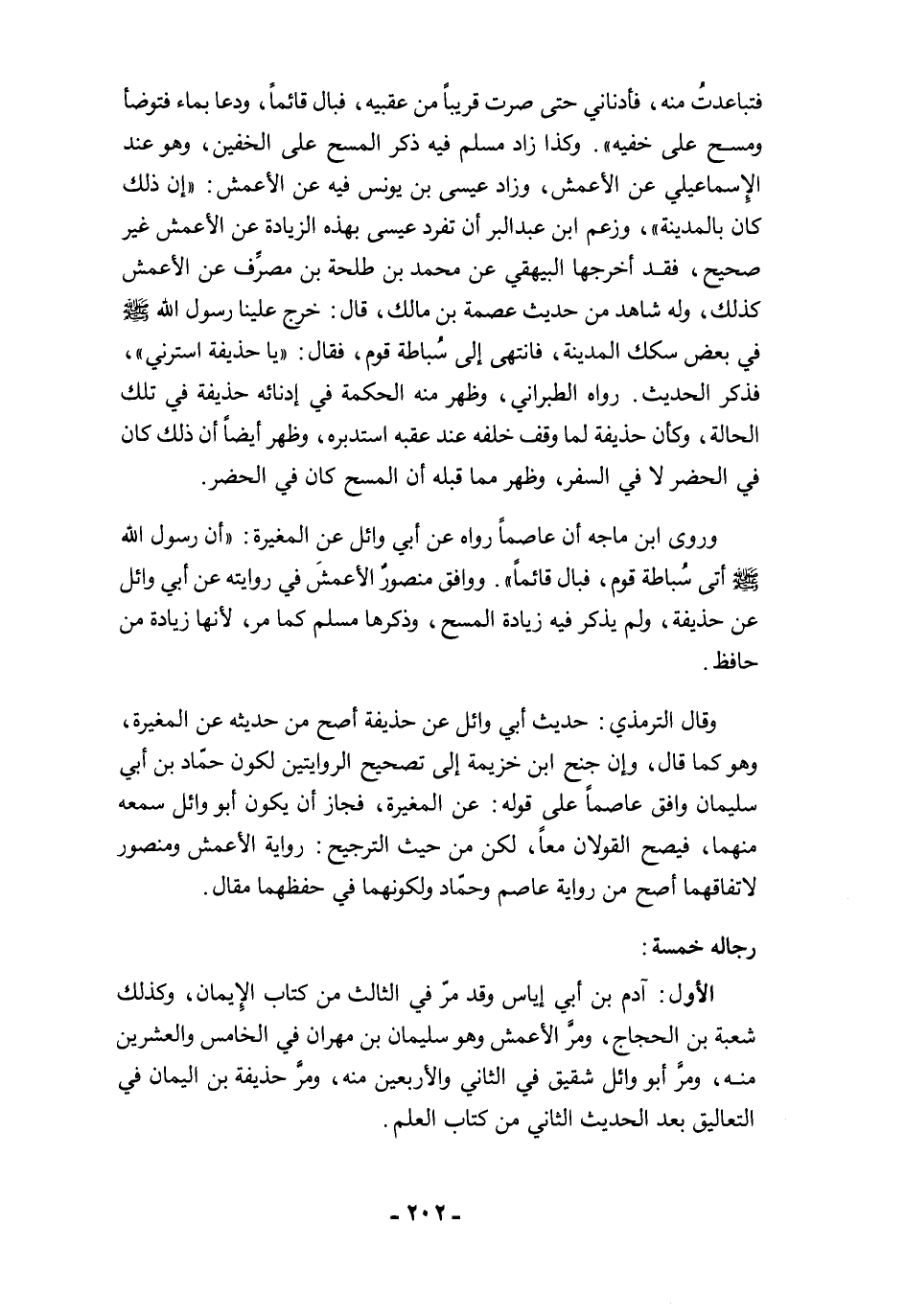 وقال الترمذي: حديث أبي وائل عن حذيفة أصح من حديثه عن المغيرة، وهو كما قال، وإن جنح ابن خزيمة إلى تصحيح الروايتين لكون حمّاد بن أبي سليمان وافق عاصمًا على قوله: عن المغيرة، فجاز أن يكون أبو وائل سمعه منهما، فيصح القولان معًا، لكن من حيث الترجيح: رواية الأعمش ومنصور لاتفاقهما أصح من رواية عاصم وحمّاد ولكونهما في حفظهما مقال.