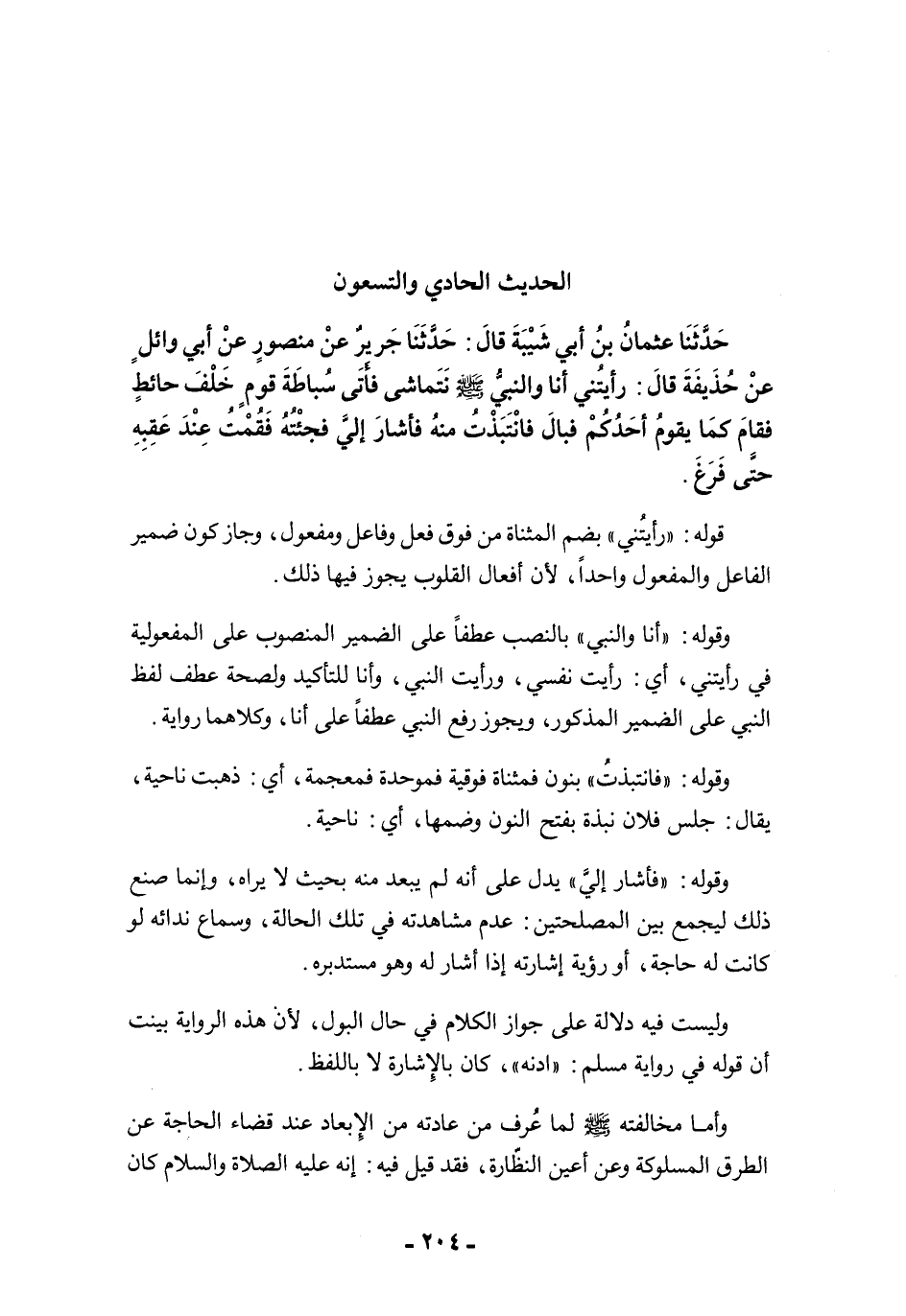 حَدَّثَنَا عُثْمَانُ بْنُ أَبِي شَيْبَةَ قَالَ: حَدَّثَنَا جَرِيرٌ عَنْ مَنْصُورٍ عَنْ أَبِى وَائِلٍ عَنْ حُذَيْفَةَ قَالَ: رَأَيْتُنِي أَنَا وَالنَّبِيُّ -صلى الله عليه وسلم- نَتَمَاشَى، فَأَتَى سُبَاطَةَ قَوْمٍ خَلْفَ حَائِطٍ، فَقَامَ كَمَا يَقُومُ أَحَدُكُمْ فَبَالَ، فَانْتَبَذْتُ مِنْهُ، فَأَشَارَ إِلَيَّ فَجِئْتُهُ، فَقُمْتُ عِنْدَ عَقِبِهِ حَتَّى فَرَغَ.