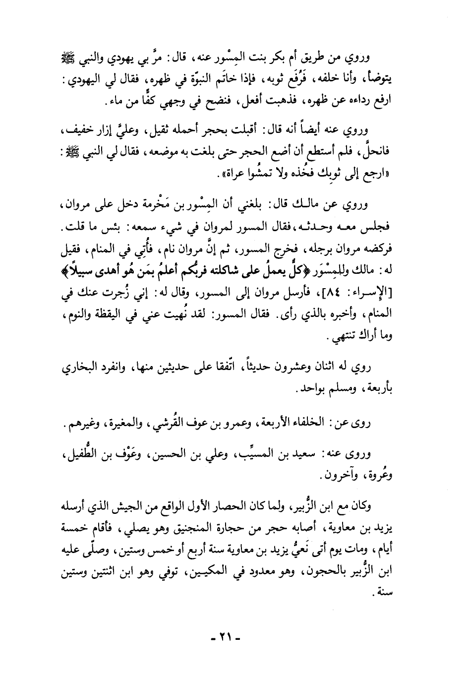 وروي من طريق أم بكر بنت المِسْور عنه، قال: مرَّ بي يهودي والنبي -صلى الله عليه وسلم- يتوضأ، وأنا خلفه، فَرُفَع ثوبه، فإذا خاتَم النبوّة في ظهره، فقال لي اليهودي: ارفع رداءه عن ظهره، فذهبت أفعل، فنضح في وجهي كفًّا من ماء.