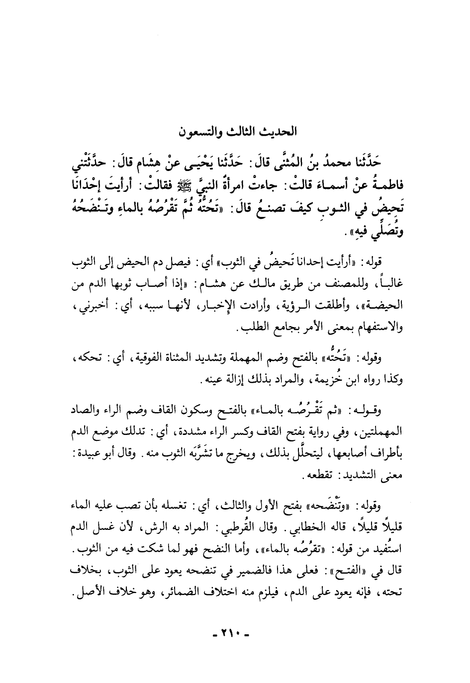 حَدَّثَنَا مُحَمَّدُ بْنُ الْمُثَنَّى قَالَ: حَدَّثَنَا يَحْيَى عَنْ هِشَامٍ قَالَ: حَدَّثَتْنِي فَاطِمَةُ عَنْ أَسْمَاءَ قَالَتْ: جَاءَتِ امْرَأَةٌ النَّبِيَّ -صلى الله عليه وسلم- فَقَالَتْ: أَرَأَيْتَ إِحْدَانَا تَحِيضُ فِي الثَّوْبِ كَيْفَ تَصْنَعُ قَالَ: "تَحُتُّهُ، ثُمَّ تَقْرُصُهُ بِالْمَاءِ، وَتَنْضَحُهُ وَتُصَلِّي فِيهِ".