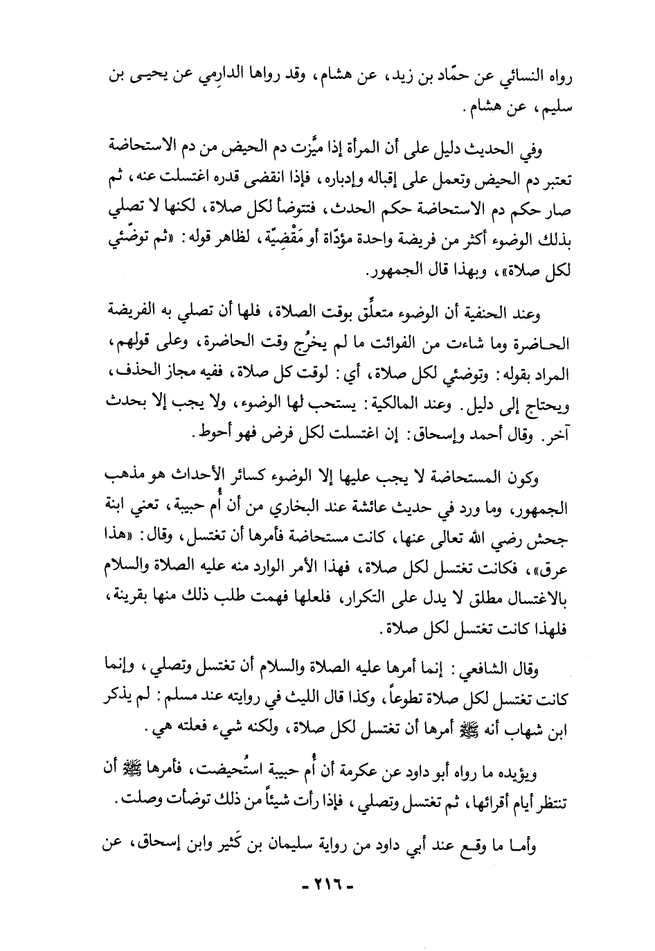 وكون المستحاضة لا يجب عليها إلا الوضوء كسائر الأحداث هو مذهب الجمهور، وما ورد في حديث عائشة عند البخاري من أن أُم حبيبة، تعني ابنة جحش رضي الله تعالى عنها، كانت مستحاضة فأمرها أن تغتسل، وقال: "هذا عرق"، فكانت تغتسل لكل صلاة، فهذا الأمر الوارد منه عليه الصلاة والسلام بالاغتسال مطلق لا يدل على التكرار، فلعلها فهمت طلب ذلك منها بقرينة، فلهذا كانت تغتسل لكل صلاة.