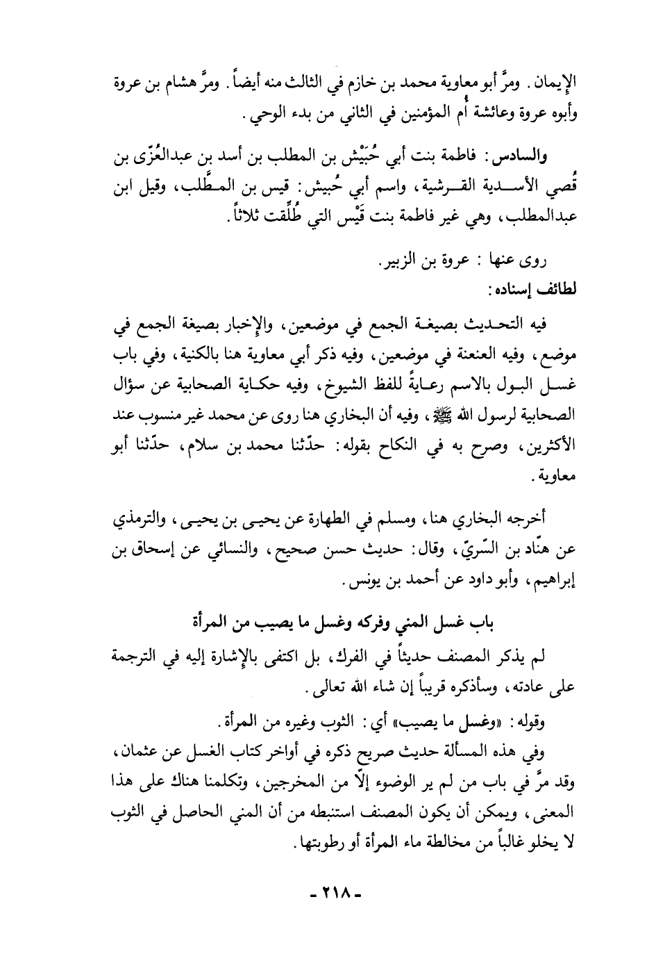 فيه التحديث بصيغة الجمع في موضعين، والإخبار بصيغة الجمع في موضع، وفيه العنعنة في موضعين، وفيه ذكر أبي معاوية هنا بالكنية، وفي باب غسل البول بالاسم رعايةً للفظ الشيوخ، وفيه حكاية الصحابية عن سؤال الصحابية لرسول الله -صلى الله عليه وسلم-، وفيه أن البخاري هنا روى عن محمد غير منسوب عند الأكثرين، وصرح به في النكاح بقوله: حدّثنا محمد بن سلام، حدّثنا أبو معاوية.