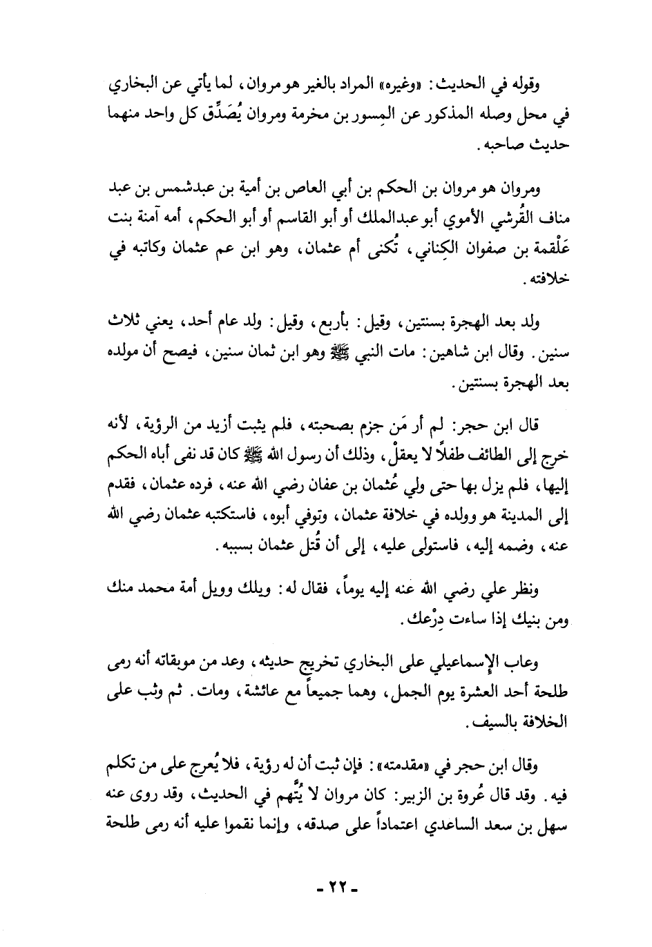 وقال ابن حجر في "مقدمته": فإن ثبت أن له رؤية، فلا يُعرج على من تكلم فيه. وقد قال عُروة بن الزبير: كان مروان لا يُتَّهم في الحديث، وقد روى عنه سهل بن سعد الساعدي اعتمادًا على صدقه، وإنما نقموا عليه أنه رمى طلحة