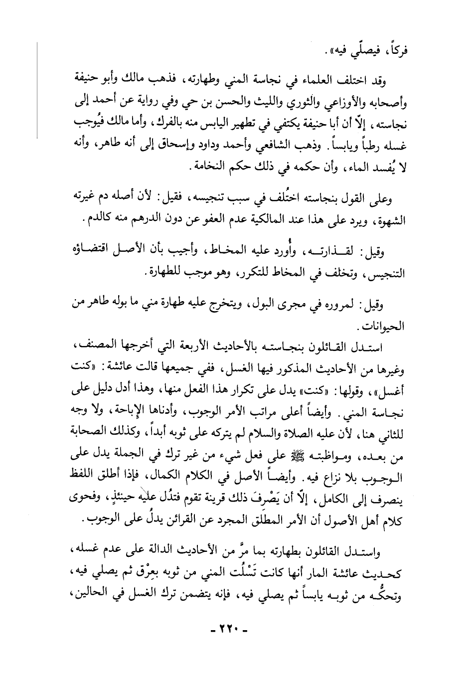 وقد اختلف العلماء في نجاسة المني وطهارته، فذهب مالك وأبو حنيفة وأصحابه والأوزاعي والثوري والليث والحسن بن حي وفي رواية عن أحمد إلى نجاسته، إلاَّ أن أبا حنيفة يكتفي في تطهير اليابس منه بالفرك، وأما مالك فيُوجب غسله رطبًا ويابسًا. وذهب الشافعي وأحمد وداود وإسحاق إلى أنه طاهر، وأنه لا يُفسد الماء، وأن حكمه في ذلك حكم النخامة.