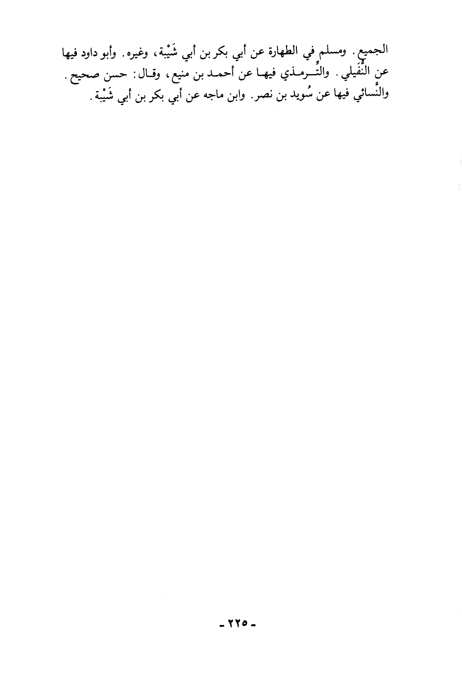 الجميع. ومسلم في الطهارة عن أبي بكر بن أبي شَيْبة، وغيره. وأبو داود فيها عن النُّفَيلي. والتِّرمذي فيها عن أحمد بن منيع، وقال: حسن صحيح. والنَّسائي فيها عن سُويد بن نصر. وابن ماجه عن أبي بكر بن أبي شَيْبة.
