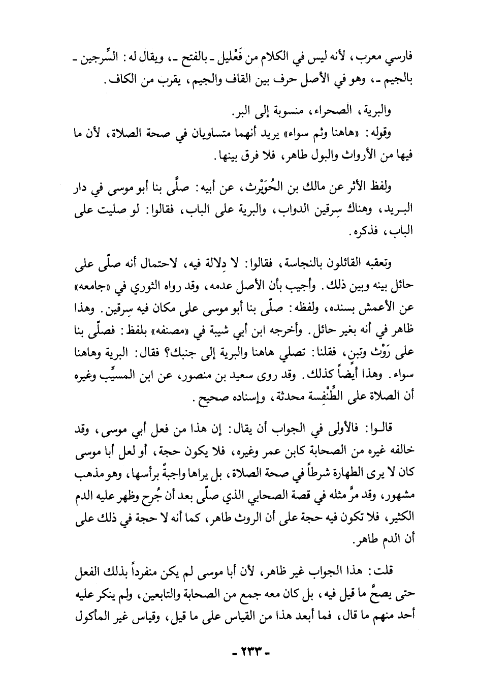وتعقبه القائلون بالنجاسة، فقالوا: لا دِلالة فيه، لاحتمال أنه صلّى على حائل بينه وبين ذلك. وأجيب بأن الأصل عدمه، وقد رواه الثوري في "جامعه" عن الأعمش بسنده، ولفظه: صلّى بنا أبو موسى على مكان فيه سِرقين. وهذا ظاهر في أنه بغير حائل. وأخرجه ابن أبي شيبة في "مصنفه" بلفظ: فصلّى بنا على رَوْث وتبنٍ، فقلنا: تصلي هاهنا والبرية إلى جنبك؟ فقال: البرية وهاهنا سواء. وهذا أيضًا كذلك. وقد روى سعيد بن منصور، عن ابن المسيب وغيره أن الصلاة على الطِّنْفِسة محدثة، وإسناده صحيح.
