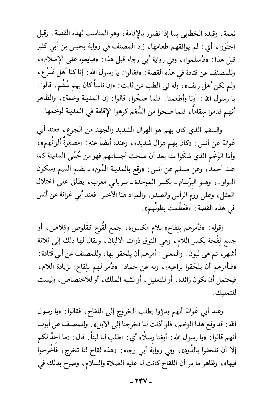 نعمة. وقيده الخطابي بما إذا تضرر بالإقامة، وهو المناسب لهذه القصة. وقيل اجتَوَوا، أي: لم يوافقهم طعامها، زاد المصنف في رواية يحيى بن أبي كثير قبل هذا: "فأسلموا"، وفي رواية أبي رجاء قبل هذا: "فبايعوه على الإِسلام"، وللمصنف عن قتادة في هذه القصة: "فقالوا: يا رسول الله: إنا كنا أهل ضَرْع، ولم نكن أهل ريف"، وله في الطب عن ثابت: "إن ناسًا كان بهم سُقْم، قالوا: يا رسول الله: آوِنا وأطعمنا. فلما صحّوا، قالوا: إن المدينة وخمة"، والظاهر أنهم قدموا سِقامًا، فلما صحوا من السُّقم كرهوا الإقامة في المدينة لوخَمها.