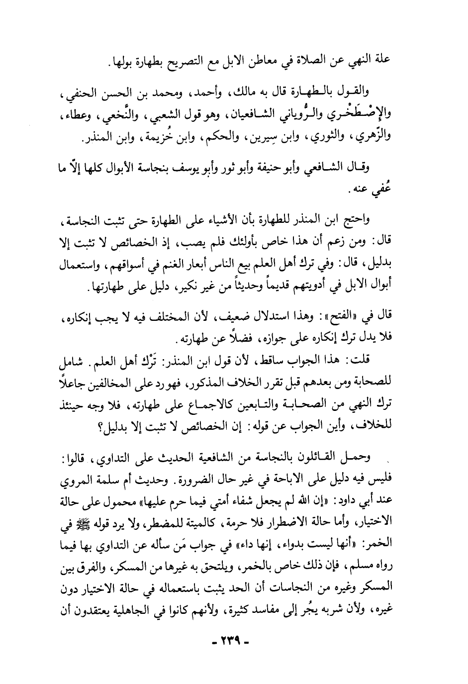 وحمل القائلون بالنجاسة من الشافعية الحديث على التداوي، قالوا: فليس فيه دليل على الإباحة في غير حال الضرورة. وحديث أم سلمة المروي عند أبي داود: "إن الله لم يجعل شفاء أمتي فيما حرم عليها" محمول على حالة الاختيار، وأما حالة الاضطرار فلا حرمة، كالميتة للمضطر، ولا يرد قوله -صلى الله عليه وسلم- في الخمر: "أنها ليست بدواء، إنها داء" في جواب مَن سأله عن التداوي بها فيما رواه مسلم، فإن ذلك خاص بالخمر، ويلتحق به غيرها من المسكر، والفرق بين المسكر وغيره من النجاسات أن الحد يثبت باستعماله في حالة الاختيار دون غيره، ولأن شربه يجُر إلى مفاسد كثيرة، ولأنهم كانوا في الجاهلية يعتقدون أن