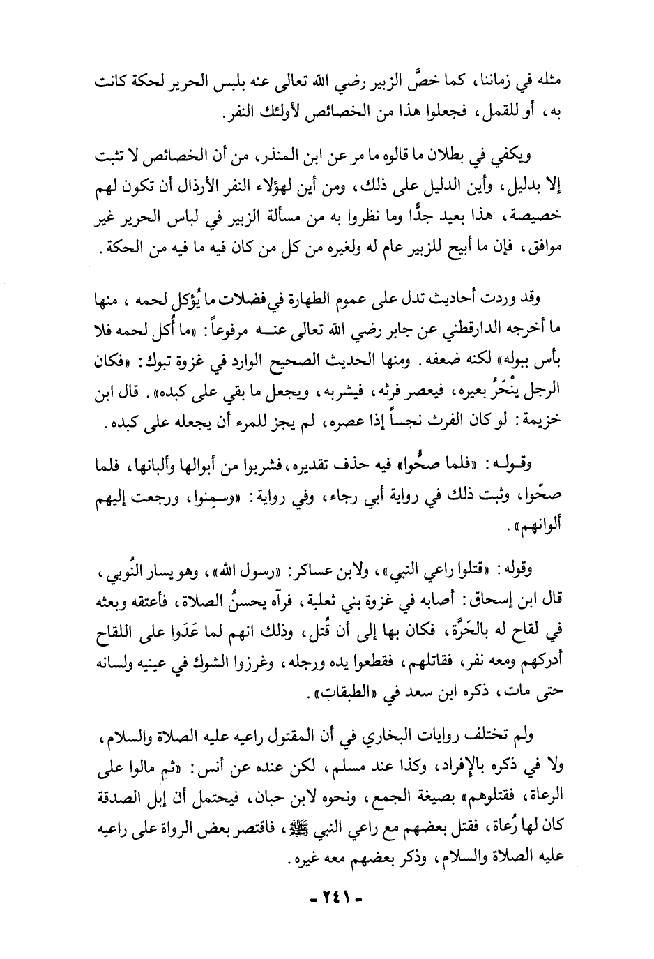 ويكفي في بطلان ما قالوه ما مر عن ابن المنذر، من أن الخصائص لا تثبت إلا بدليل، وأين الدليل على ذلك، ومن أين لهؤلاء النفر الأرذال أن تكون لهم خصيصة، هذا بعيد جدًّا وما نظروا به من مسألة الزبير في لباس الحرير غير موافق، فإن ما أبيح للزبير عام له ولغيره من كل من كان فيه ما فيه من الحكة.