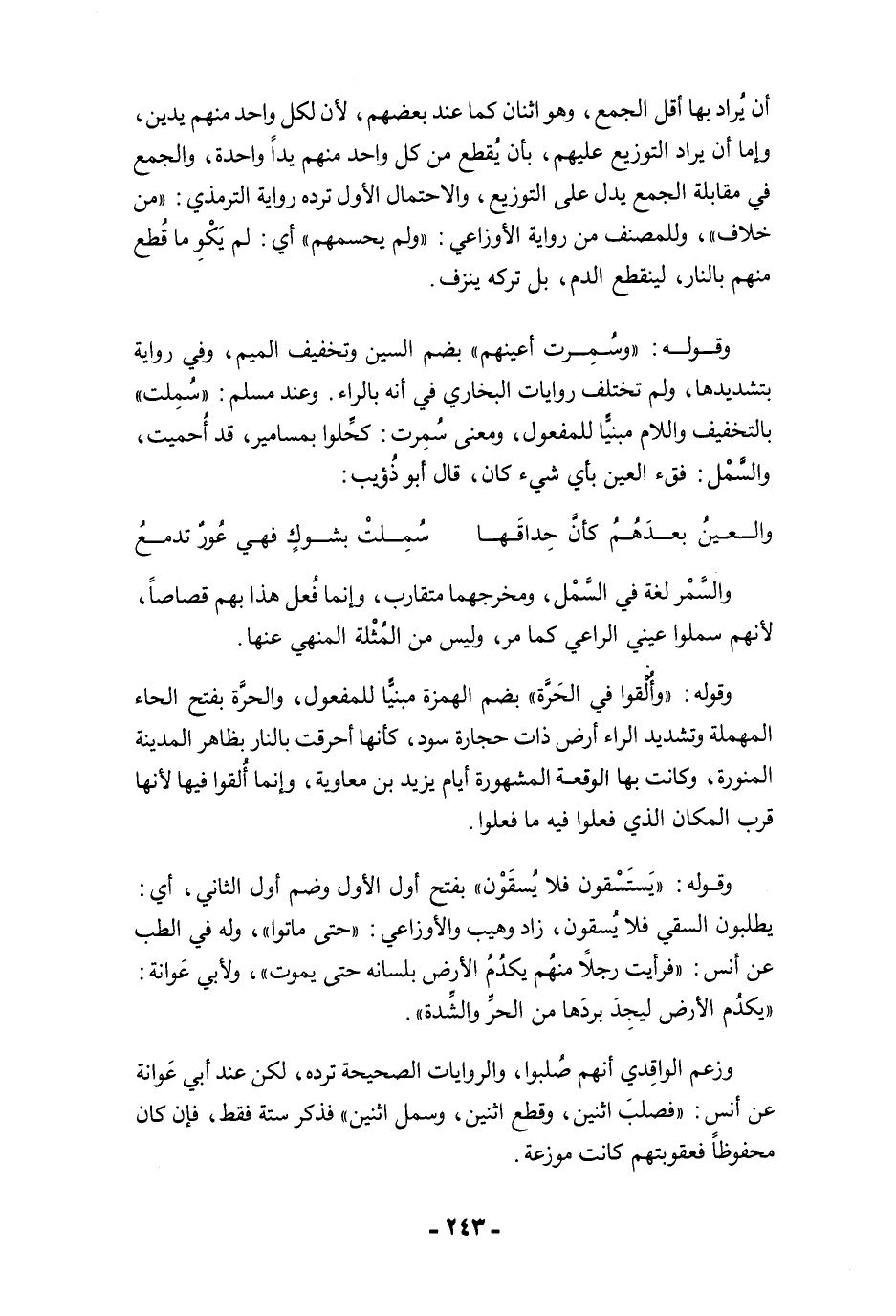 وقوله: "وسُمِرت أعينهم" بضم السين وتخفيف الميم، وفي رواية بتشديدها، ولم تختلف روايات البخاري في أنه بالراء. وعند مسلم: "سُمِلت" بالتخفيف واللام مبنيًّا للمفعول، ومعنى سُمِرت: كحِّلوا بمسامير، قد أُحميت، والسَّمْل: فقء العين بأي شيء كان، قال أبو ذُؤيب: