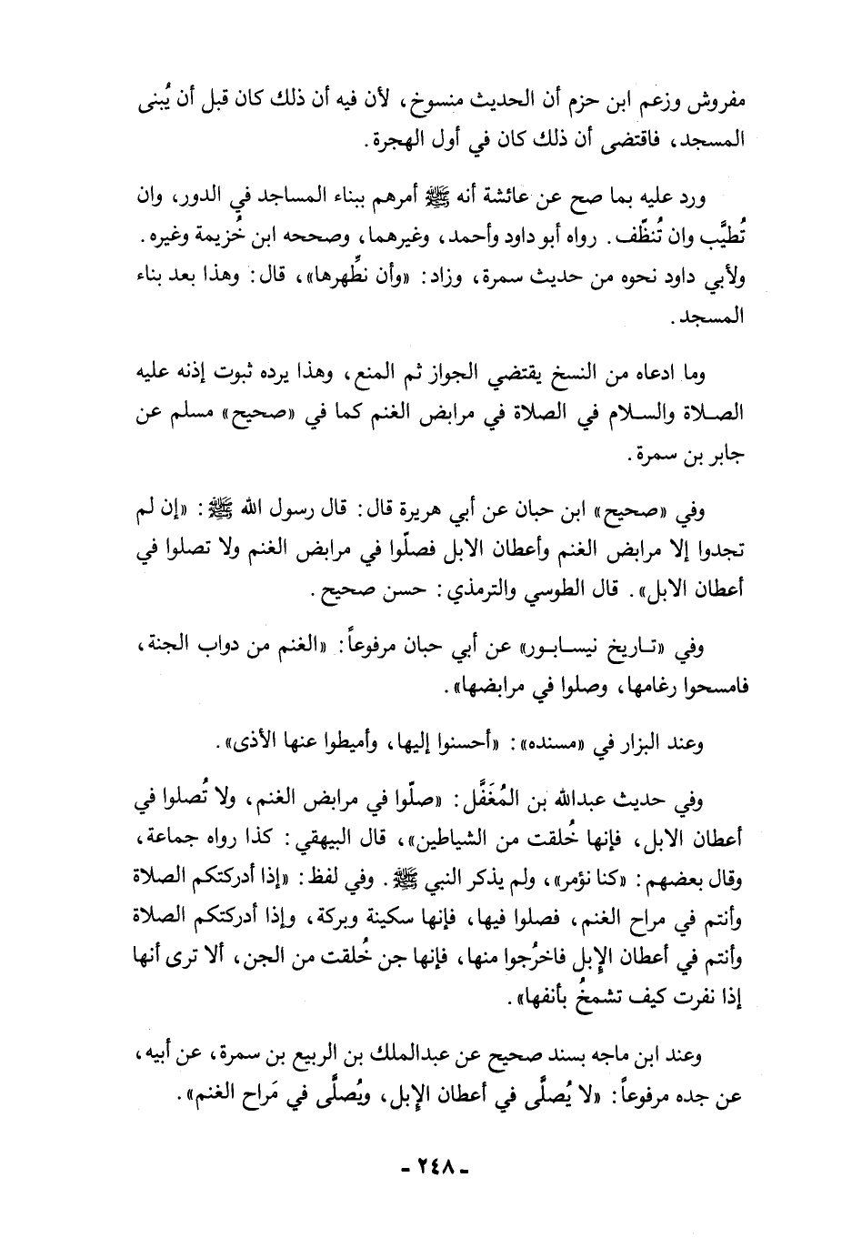 وفي "صحيح" ابن حبان عن أبي هريرة قال: قال رسول الله -صلى الله عليه وسلم-: "إن لم تجدوا إلا مرابض الغنم وأعطان الإبل فصلّوا في مرابض الغنم ولا تصلوا في أعطان الإبل". قال الطوسي والترمذي: حسن صحيح.