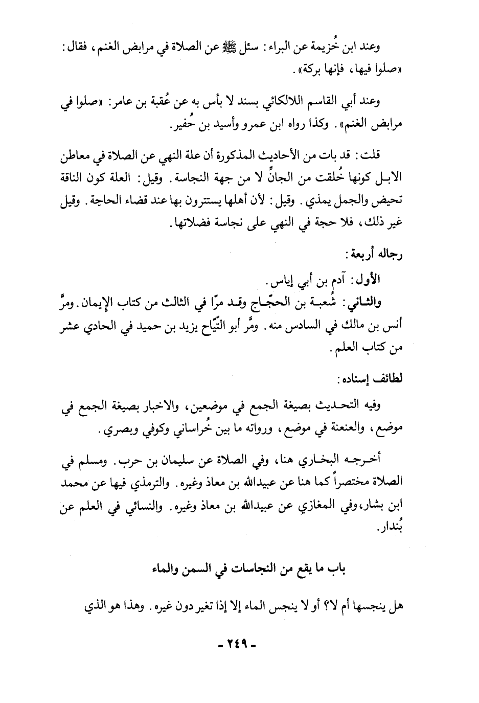 وعند أبي القاسم اللالكائي بسند لا بأس به عن عُقبة بن عامر: "صلوا في مرابض الغنم". وكذا رواه ابن عمرو وأسيد بن حُفير.