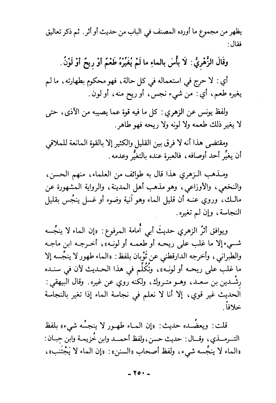 ويوافق أثرُ الزهري حديثَ أبي أُمامة المرفوع: "إن الماء لا ينجِّسه شيء إلا ما غلب على ريحه أو طعمه أو لونه"، أخرجه ابن ماجه والطبراني، وأخرجه الدارقطني عن ثَوْبان بلفظ: "الماء طهور لا ينجِّسه إلا ما غلب على ريحه أو لونه"، وتُكُلِّم في هذا الحديث لأن في سنده رِشْدين بن سعد، وهو متروك، ولكنه روي عن غيره. وقال البيهقي: الحديث غير قوي، إلا أنا لا نعلم في نجاسة الماء إذا تغير بالنجاسة خلافًا.