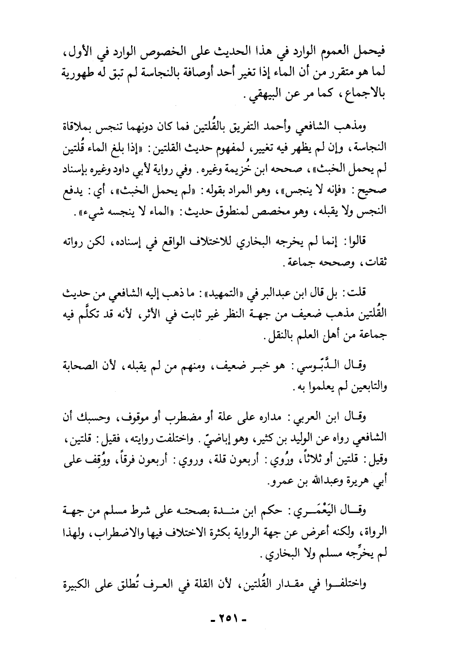 قلت: بل قال ابن عبد البر في "التمهيد": ما ذهب إليه الشافعي من حديث القُلتين مذهب ضعيف من جهة النظر غير ثابت في الأثر؛ لأنه قد تكلَّم فيه جماعة من أهل العلم بالنقل.