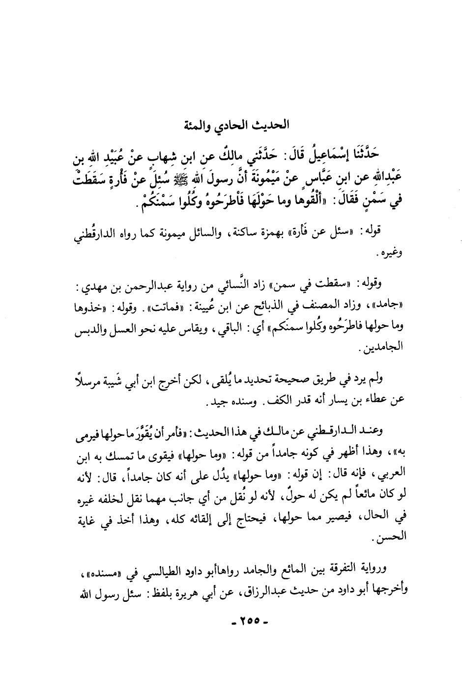 حَدَّثَنَا إِسْمَاعِيلُ قَالَ: حَدَّثَنِي مَالِكٌ عَنِ ابْنِ شِهَابٍ عَنْ عُبَيْدِ اللَّهِ بْنِ عَبْدِ اللَّهِ عَنِ ابْنِ عَبَّاسٍ عَنْ مَيْمُونَةَ أَنَّ رَسُولَ اللَّهِ -صلى الله عليه وسلم- سُئِلَ عَنْ فَأْرَةٍ سَقَطَتْ فِي سَمْنٍ فَقَالَ: "أَلْقُوهَا وَمَا حَوْلَهَا فَاطْرَحُوهُ. وَكُلُوا سَمْنَكُمْ".