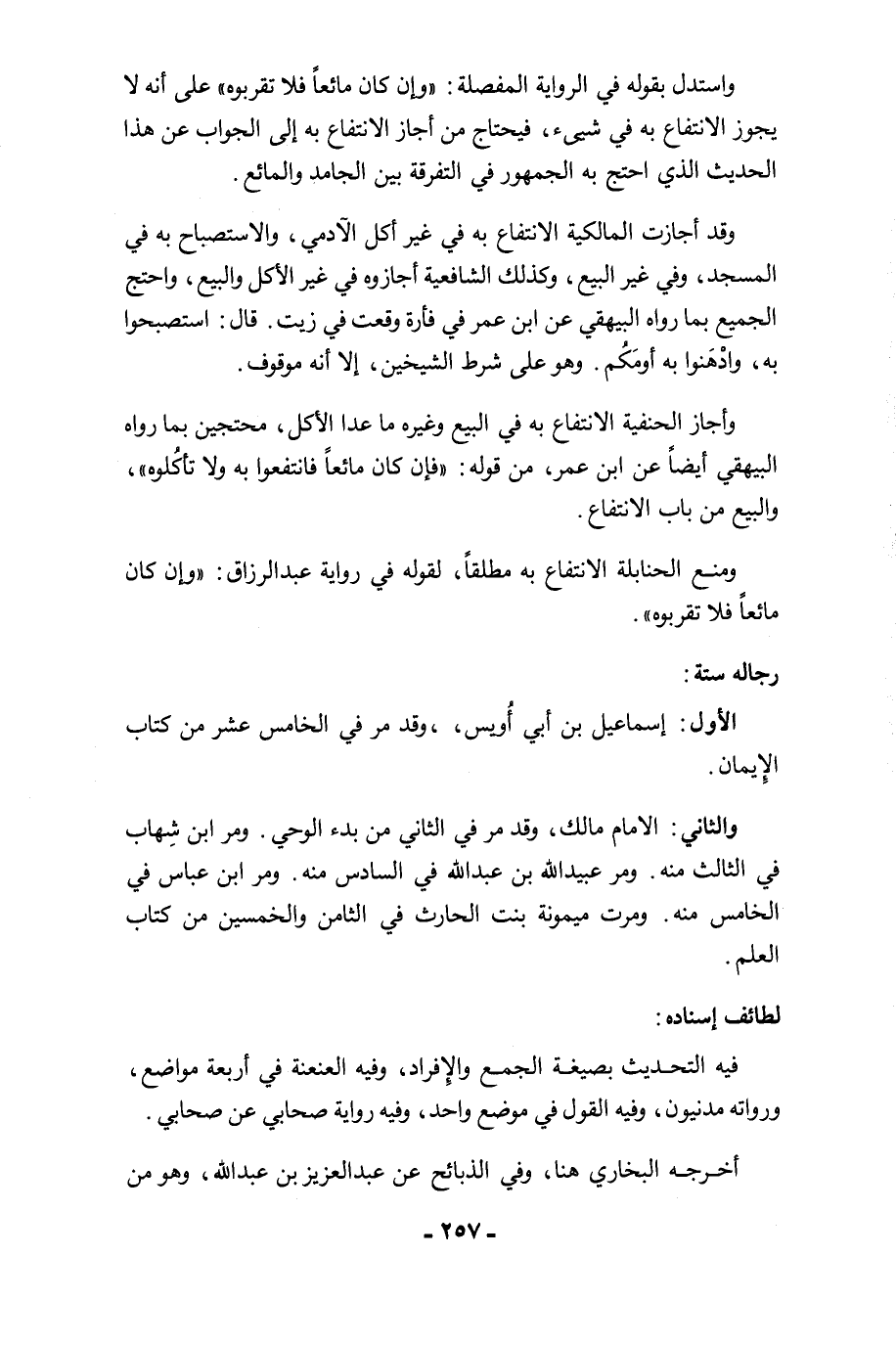 وقد أجازت المالكية الانتفاع به في غير أكل الآدمي، والاستصباح به في المسجد، وفي غير البيع، وكذلك الشافعية أجازوه في غير الأكل والبيع، واحتج الجميع بما رواه البيهقي عن ابن عمر في فأرة وقعت في زيت. قال: استصبحوا به، وادْهَنوا به أومَكُم. وهو على شرط الشيخين، إلا أنه موقوف.
