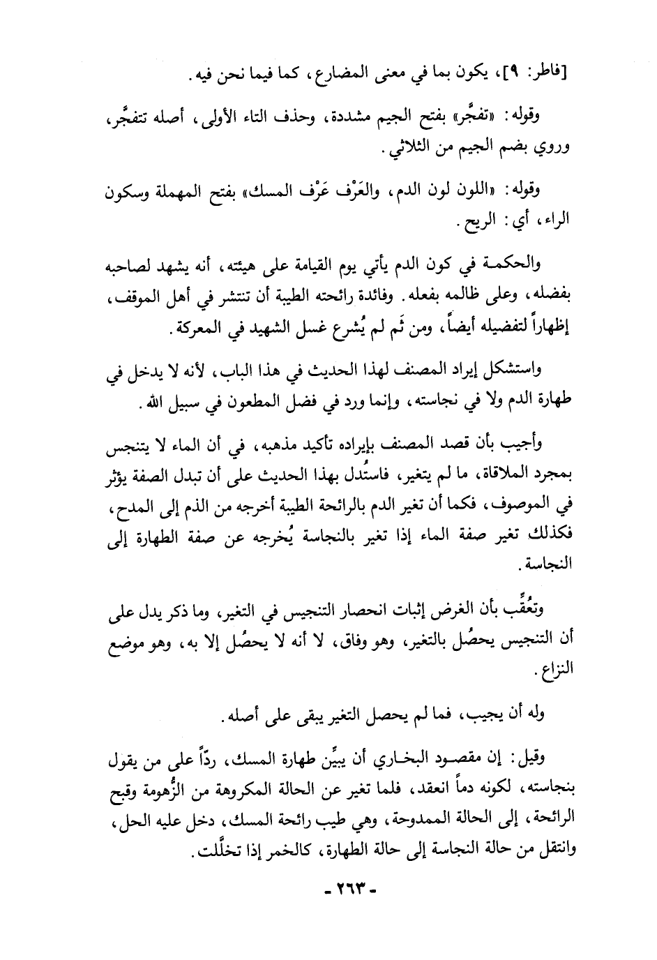 وقيل: إن مقصود البخاري أن يبيِّن طهارة المسك، ردًّا على من يقول بنجاسته، لكونه دمًا انعقد، فلما تغير عن الحالة المكروهة من الزُّهومة وقبح الرائحة، إلى الحالة الممدوحة، وهي طيب رائحة المسك، دخل عليه الحل، وانتقل من حالة النجاسة إلى حالة الطهارة، كالخمر إذا تخلَّلت.