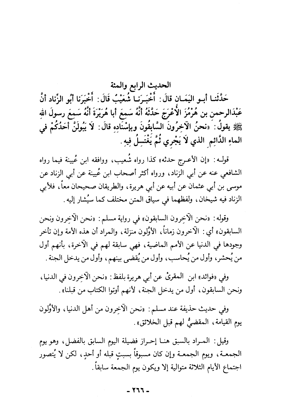 حَدَّثَنَا أَبُو الْيَمَانِ قَالَ: أَخْبَرَنَا شُعَيْبٌ قَالَ: أَخْبَرَنَا أَبُو الزِّنَادِ أَنَّ عَبْدَ الرَّحْمَنِ بْنَ هُرْمُزَ الأَعْرَجَ حَدَّثَهُ أَنَّهُ سَمِعَ أَبَا هُرَيْرَةَ أَنَّهُ سَمِعَ رَسُولَ اللَّهِ -صلى الله عليه وسلم- يَقُولُ: "نَحْنُ الآخِرُونَ السَّابِقُونَ". وَبِإِسْنَادِهِ قَالَ: "لاَ يَبُولَنَّ أَحَدُكُمْ فِي الْمَاءِ الدَّائِمِ الَّذِي لاَ يَجْرِي، ثُمَّ يَغْتَسِلُ فِيهِ".
