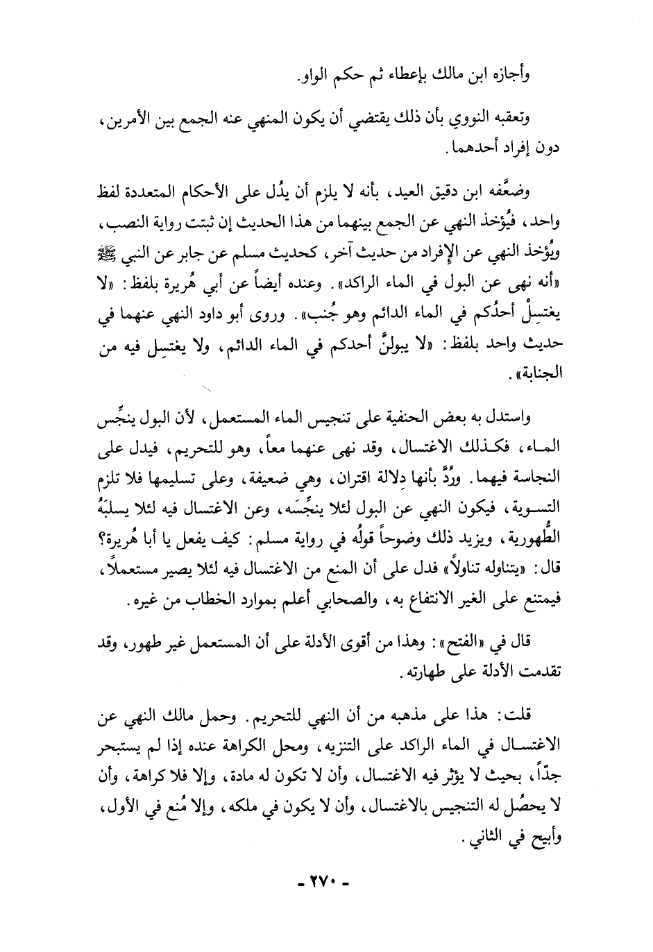 وضعَّفه ابن دقيق العيد، بأنه لا يلزم أن يدُل على الأحكام المتعددة لفظ واحد، فيُؤخذ النهي عن الجمع بينهما من هذا الحديث إن ثبتت رواية النصب، ويُؤخذ النهي عن الإفراد من حديث آخر، كحديث مسلم عن جابر عن النبي -صلى الله عليه وسلم- "أنه نهى عن البول في الماء الراكد". وعنده أيضًا عن أبي هُريرة بلفظ: "لا يغتسِلْ أحدُكم في الماء الدائم وهو جُنب". وروى أبو داود النهي عنهما في حديث واحد بلفظ: "لا يبولنَّ أحدكم في الماء الدائم، ولا يغتسِل فيه من الجنابة".