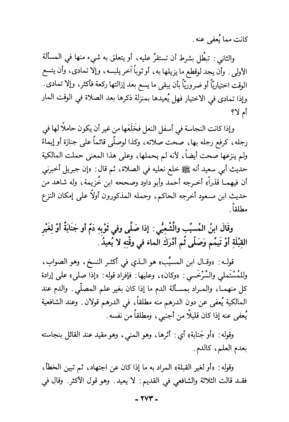 وإذا كانت النجاسة في أسفل النعل فخَلَعَها من غير أن يكون حاملًا لها في رجله، كرفع رجله بها، صحت صلاته، وكذا لو صلّى قائمًا على جنازة أو إيماءً ولم ينزعها صحت أيضًا، لأنه لم يحملها، وعلى هذا المعنى حملت المالكية حديث أبي سعيد أنه -صلى الله عليه وسلم- خلع نعليه في الصلاة، ثم قال: "إن جبريل أخبرني أن فيهما قذرًا" أخرجه أحمد وأبو داود وصححه ابن خُزيمة، وله شاهد من حديث ابن مسعود أخرجه الحاكم، وحمله المذكورون أولًا على إمكان النزع مطلقًا.