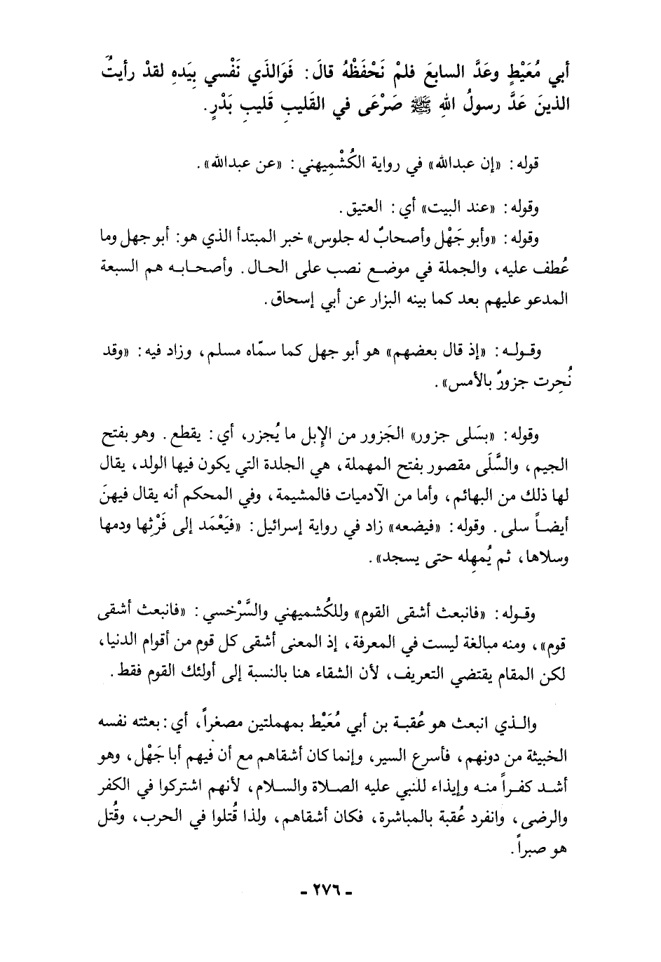 أَبِي مُعَيْطٍ". وَعَدَّ السَّابِعَ فَلَمْ يَحْفَظْهُ قَالَ: فَوَالَّذِي نَفْسِي بِيَدِهِ، لَقَدْ رَأَيْتُ الَّذِينَ عَدَّ رَسُولُ اللَّهِ -صلى الله عليه وسلم- صَرْعَى فِي الْقَلِيبِ قَلِيبِ بَدْرٍ.