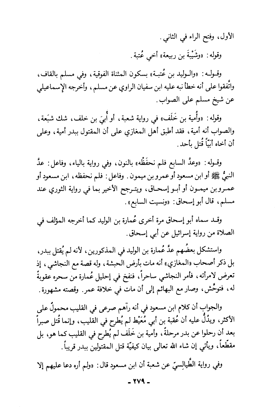 واستشكل بعضُهم عدَّ عُمارة بن الوليد في المذكورين؛ لأنه لم يُقتل ببدر، بل ذكر أصحاب "المغازي" أنه مات بأرض الحبشة، وله قصة مع النجاشي، إذ تعرض لامرأته، فأمر النجاشي ساحرًا، فنفخ في إحليل عُمارة من سحره عقوبةً له، فتوحَّش، وصار مع البهائم إلى أن مات في خلافة عمر. وقصته مشهورة.