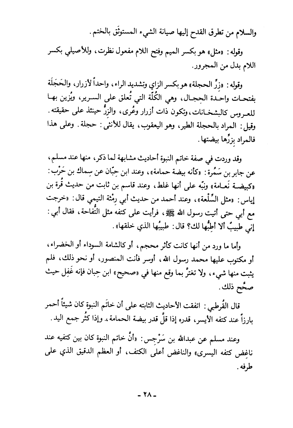 قال القُرطبي: اتفقت الأحاديث الثابته على أن خاتَم النبوة كان شيئًا أحمر بارزًا عند كتفه الأيسر، قدره إذا قلَّ قدر بيضة الحمامة ,. وإذا كثُر جمع اليد.