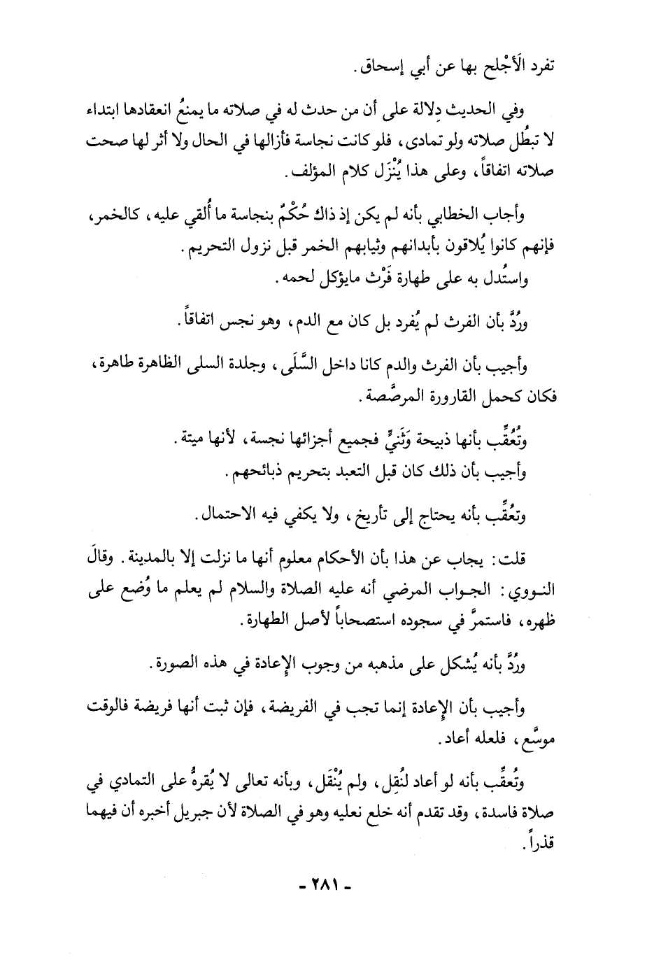 قلت: يجاب عن هذا بأن الأحكام معلوم أنها ما نزلت إلا بالمدينة. وقالَ النووي: الجواب المرضي أنه عليه الصلاة والسلام لم يعلم ما وُضع على ظهره، فاستمرَّ في سجوده استصحابًا لأصل الطهارة.