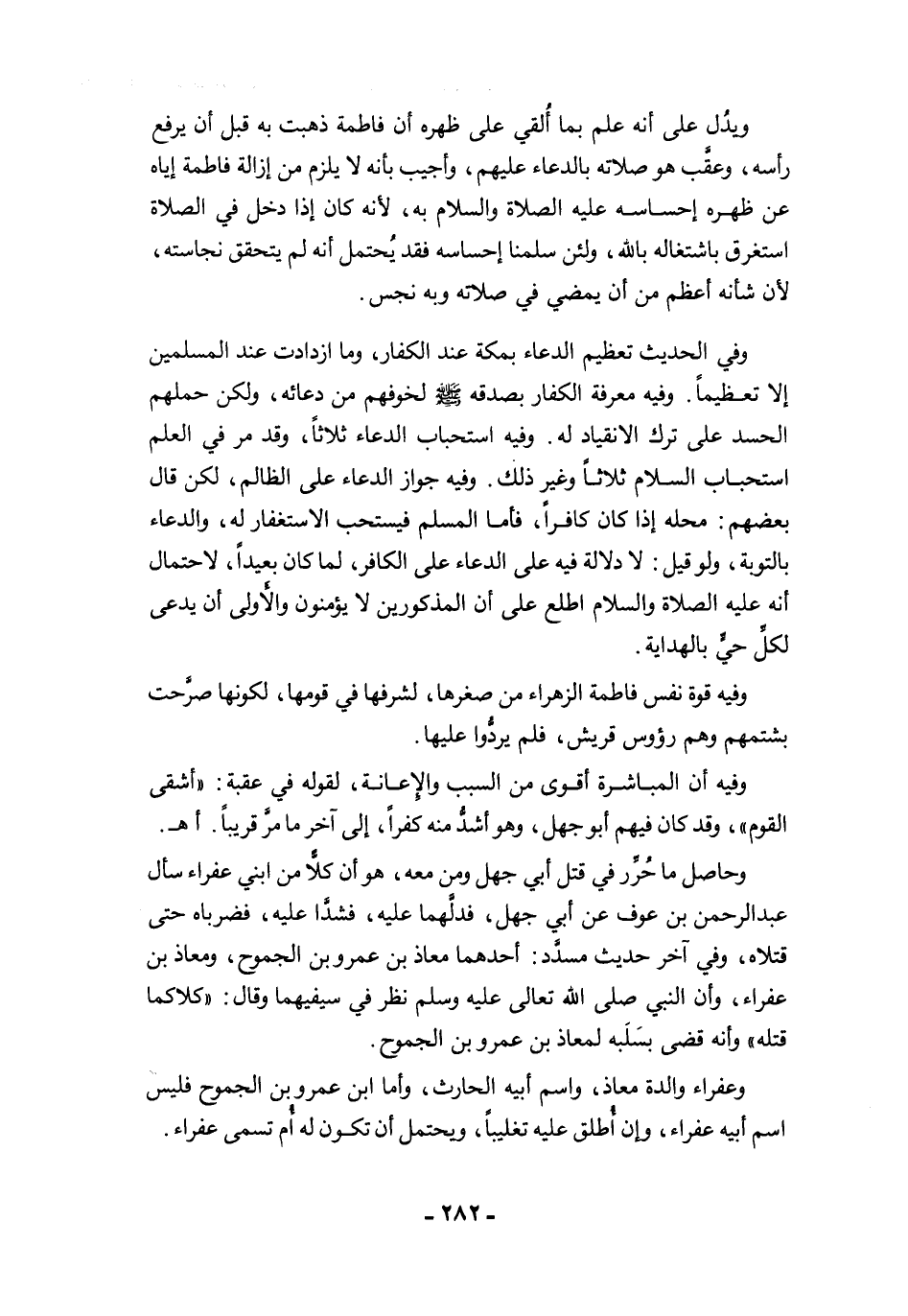 ويدُل على أنه علم بما أُلقي على ظهره أن فاطمة ذهبت به قبل أن يرفع رأسه، وعقَّب هو صلاته بالدعاء عليهم، وأجيب بأنه لا يلزم من إزالة فاطمة إياه عن ظهره إحساسه عليه الصلاة والسلام به؛ لأنه كان إذا في دخل في الصلاة استغرق باشتغاله بالله، ولئن سلمنا إحساسه فقد يُحتمل أنه لم يتحقق نجاسته، لأن شأنه أعظم من أن يمضي في صلاته وبه نجس.