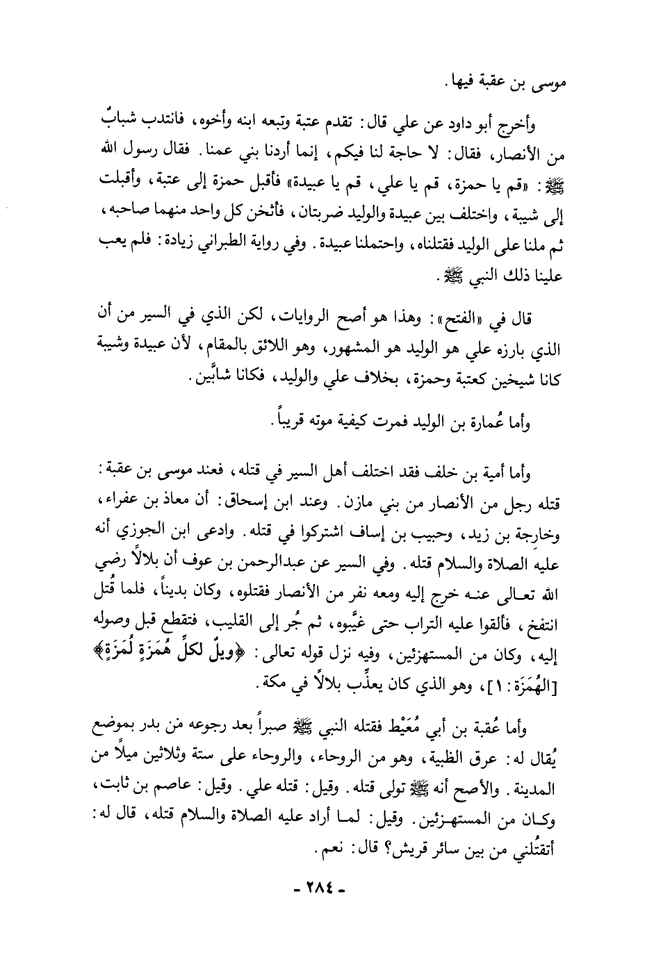 قال في "الفتح": وهذا هو أصح الروايات، لكن الذي في السير من أن الذي بارزه علي هو الوليد هو المشهور، وهو اللائق بالمقام؛ لأن عبيدة وشيبة كانا شيخين كعتبة وحمزة، بخلاف علي والوليد، فكانا شابَّين.