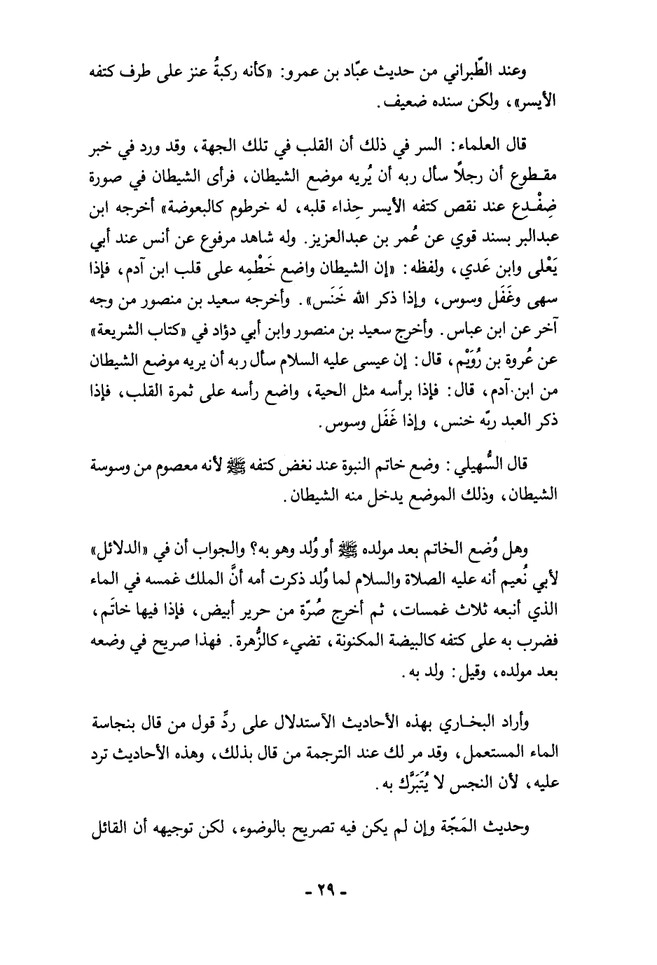 قال السُّهيلي: وضع خاتم النبوة عند نغض كتفه -صلى الله عليه وسلم- لأنه معصوم من وسوسة الشيطان، وذلك الموضع يدخل منه الشيطان.