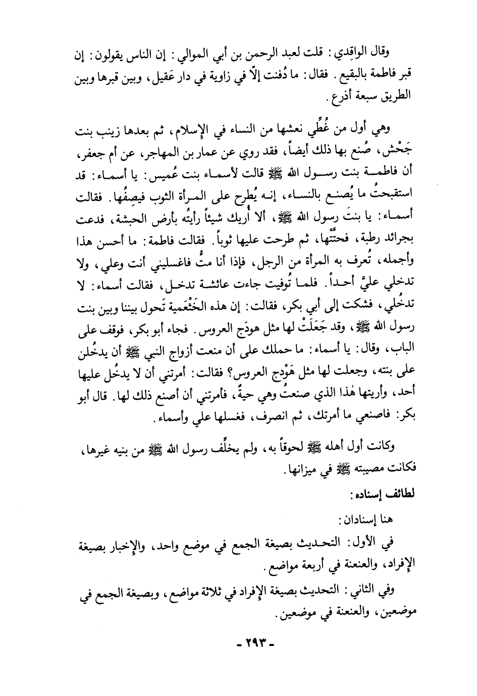 وقال الواقِدي: قلت لعبد الرحمن بن أبي الموالي: إن الناس يقولون: إن قبر فاطمة بالبقيع. فقال: ما دُفنت إلاَّ في زاوية في دار عَقيل، وبين قبرها وبين الطريق سبعة أذرع.