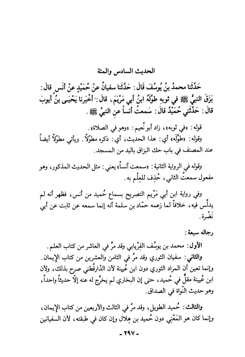 والثاني: سفيان الثوري وقد مرَّ في الثامن والعشرين من كتاب الإيمان. وإنما تعين أن المراد الثوري دون ابن عُيينة لأن الدّارقُطني صرح بذلك، ولأن ابن عُيينة مقلٌّ في حُميد، حتى إن البخاري لم يخرِّج له عنه إلاَّ حديثًا واحدًا، وهو حديث النّواة في الصداق.