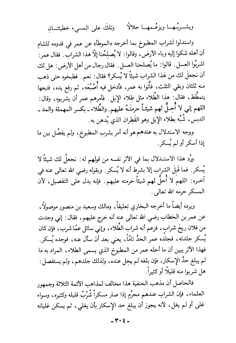 واستدلوا لشراب المطبوخ بما أخرجه "الموطأ" عن عمر في قدومه للشام أن أهله شكوا إليه وباء الأرض، وقالوا: لا يُصلِخنا إلاَّ هذا الشراب. فقال عمر: اشربُوا العسل. قالوا: ما يُصلحنا العسل. فقال رجال من أهل الأرض: هل لك أن نجعلَ لك من هذا الشراب شيئًا لا يُسكر؟ فقال: نعم. فطبخوه حتى ذهب منه ثلثان وبقي الثلث، فأتَوا به عمر، فأدخل فيه أُصْبُعَه، ثم رفع يده، فتبعها يتمطَّط، فقال: هذا الطِّلاء مثل طِلاء الإِبل. فأمرهم عمر أن يشربوه، وقال: اللهم إني لا أُحِلُّ لهم شيئًا حرمتَهُ عليهم. والطِّلاء -بكسر المهملة والمد- الدبس، شُبِّه بطلاء الإبل وهو القَطِران الذي يُدهن به.