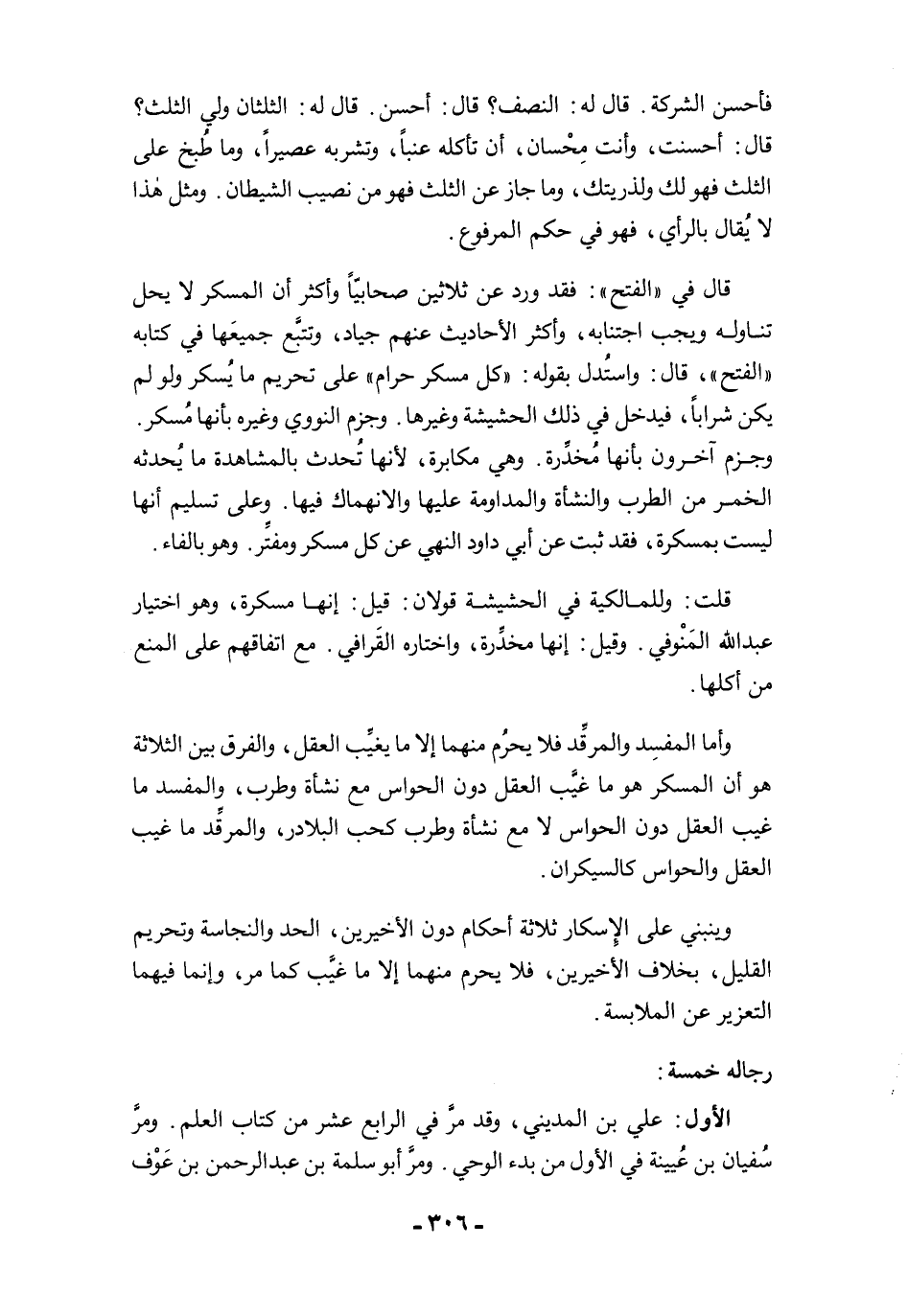 قلت: وللمالكية في الحشيشة قولان: قيل: إنها مسكرة، وهو اختيار عبد الله المَنْوفي. وقيل: إنها مخدِّرة، واختاره القَرافي. مع اتفاقهم على المنع من أكلها.