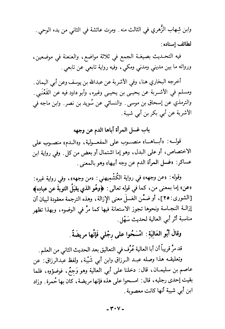 وتعليقه هذا وصله عبد الرزاق وابن أبي شَيْبة، ولفظ عبد الرزاق: عن عاصم بن سليمان، قال: دخلنا على أبي العالية وهو وَجِعٌ، فوضؤوه، فلما بقيت إحدى رجليه، قال: امسحوا على هذه فإنها مريضة، كان بها حُمرة. وزاد ابن أبي شيبة أنها كانت معصوبة.