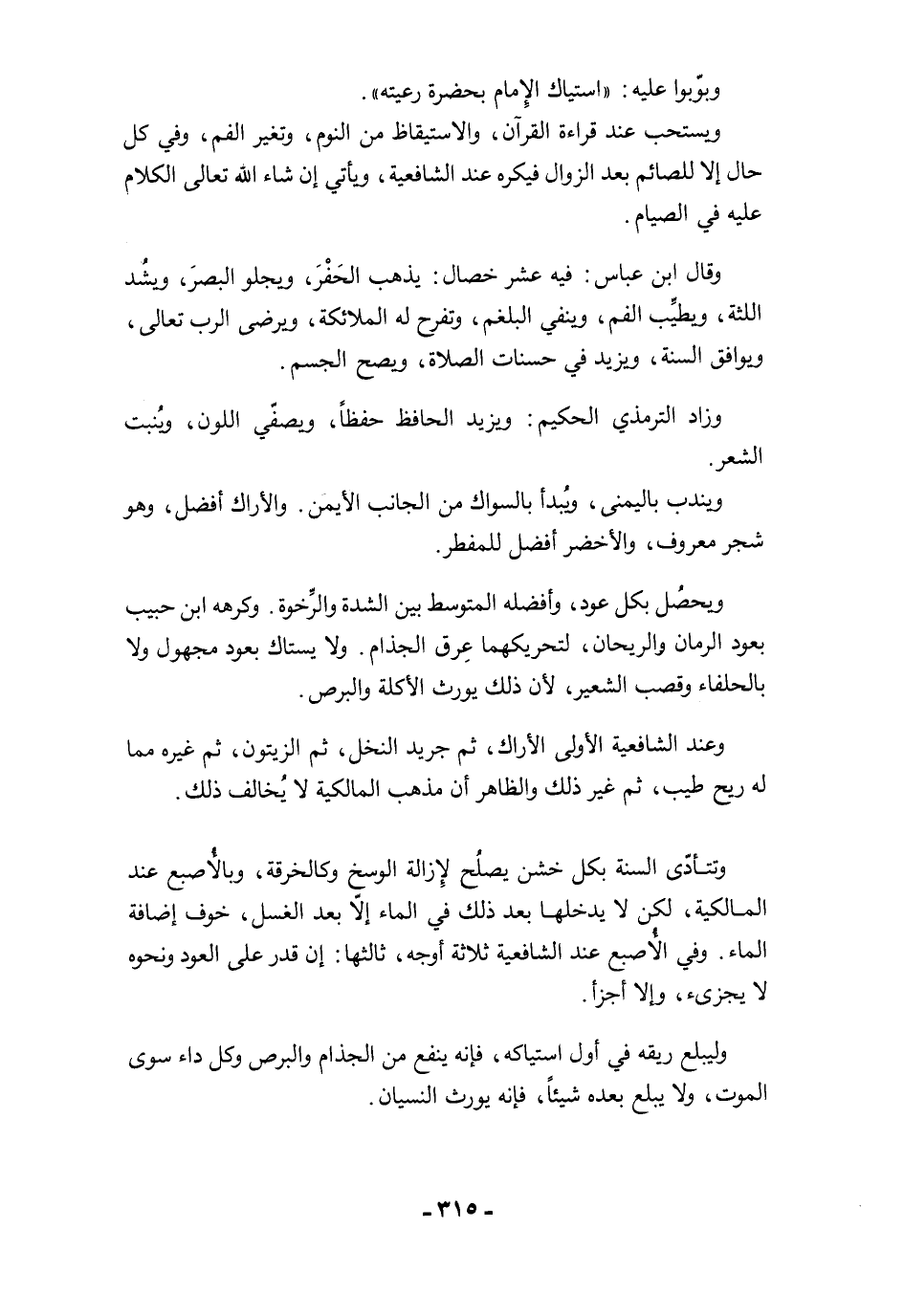 وليبلع ريقه في أول استياكه، فإنه ينفع من الجذام والبرص وكل داء سوى الموت، ولا يبلع بعده شيئًا، فإنه يورث النسيان.