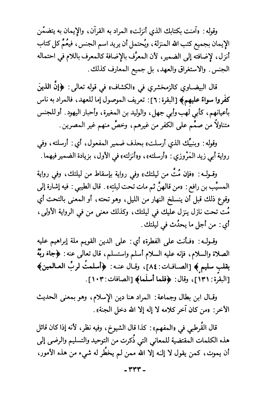 قال القُرطبي في "المفهم": كذا قال الشيوخ، وفيه نظر؛ لأنه إذا كان قائل هذه الكلمات المقتضية للمعاني التي ذُكرت من التوحيد والتسليم والرضى إلى أن يموت، كمن يقول لا إله إلا الله ممن لم يخطُر له شيء من هذه الأمور،