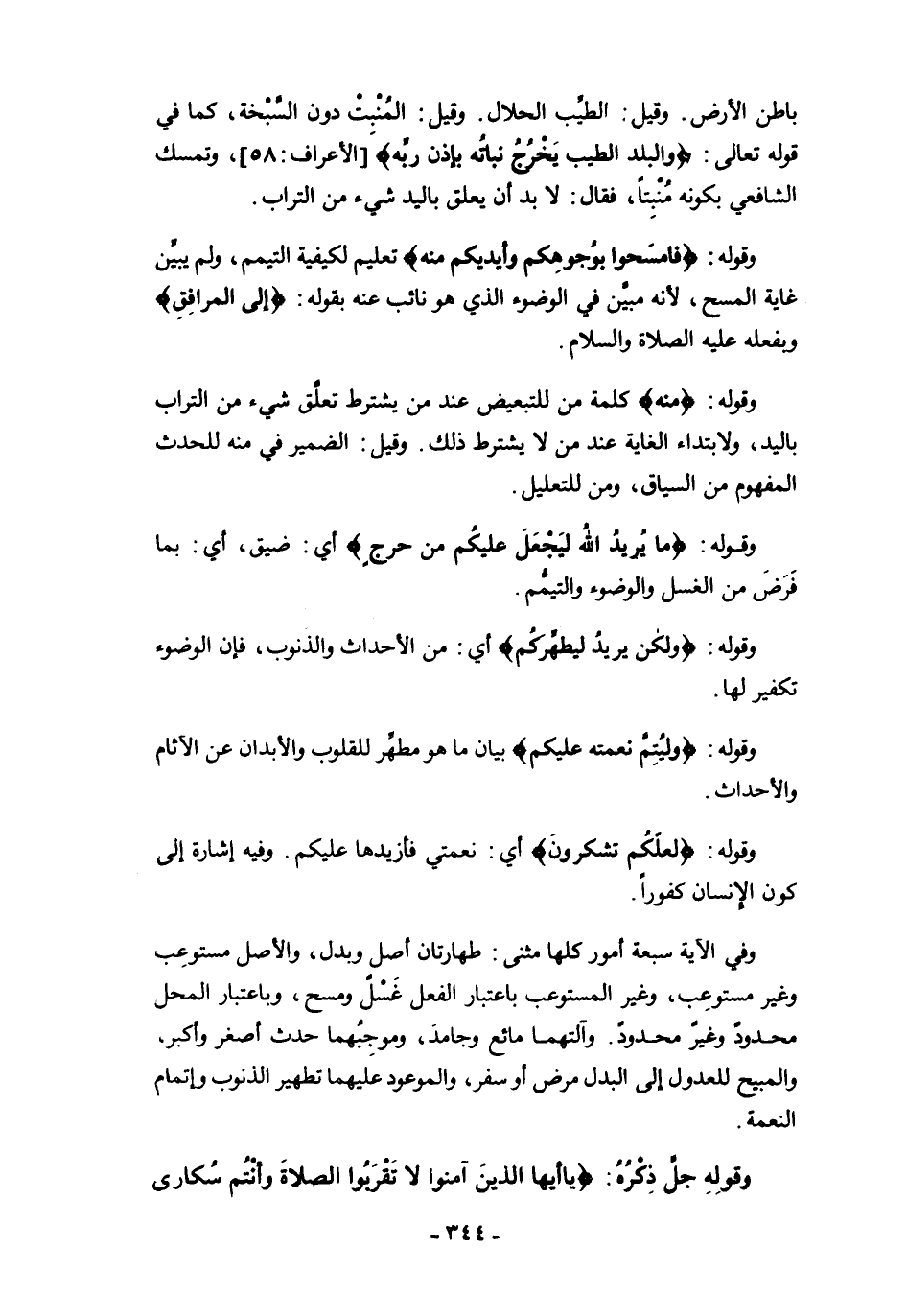 وفي الآية سبعة أمور كلها مثنى: طهارتان أصل وبدل، والأصل مستوعِب وغير مستوعِب، وغير المستوعب باعتبار الفعل غَسْلُ ومسح، وباعتبار المحل محدودٌ وغير محدودٌ. وآلتهما مائع وجامدَ، وموجِبُهما حدث أصغر وأكبر، والمبيح للعدول إلى البدل مرض أو سفر، والموعود عليهما تطهير الذنوب وإتمام النعمة.