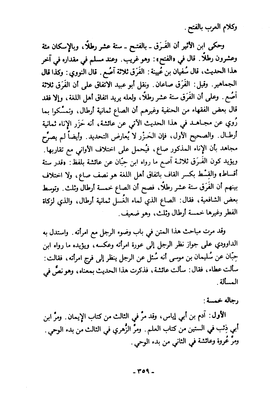 وحكى ابن الأثير أن الفَرَق -بالفتح- ستة عشر رطلًا، وبالإسكان مئة وعشرون رطلًا. قال في "الفتح": وهو غريب. وعند مسلم في مقداره في آخر هذا الحديث، قال سُفيان بن عُيينة: الفَرق ثلاثة آصُع. قال النووي: وكذا قال الجماهير. وقيل: الفَرَق صاعان. ونقل أبو عبيد الاتفاق على أن الفَرَق ثلاثة آصُع. وعلى أن الفَرَق ستة عشر رطلًا، ولعله يريد اتفاق أهل اللغة، وإلا فقد قال بعض الفقهاء من الحنفية وغيرهم أن الصاع ثمانية أرطال، وتمسَّكوا بما رُوي عن مجاهد في هذا الحديث الآتي عن عائشة، أنه حَزَر الإِناء ثمانية أرطال. والصحيح الأول، فإن الحَزْر لا يُعارض التحدبد. وأيضًا لم يصرِّح مجاهد بأن الإناء المذكور صاع، فيُحمل على اختلاف الأواني مع تقاربها. ويؤيد كون الفَرَق ثلاثه آصع ما رواه ابن حِبّان عن عائشة بلفظ: "قدر ستة أقساط" والقِسْط بكسر القاف باتفاق أهل اللغة هو نصف صاع، ولا اختلاف بينهم أن الفَرَق ستة عشر رطلًا، فصح أن الصالح خمسة أرطال وثلث. وتوسط بعض الشافعية، فقال: الصاع الذي لماء الغسل ثمانية أرطال، والذي لزكاة الفطر وغيرها خمسة أرطال وثلث، وهو ضعيف.