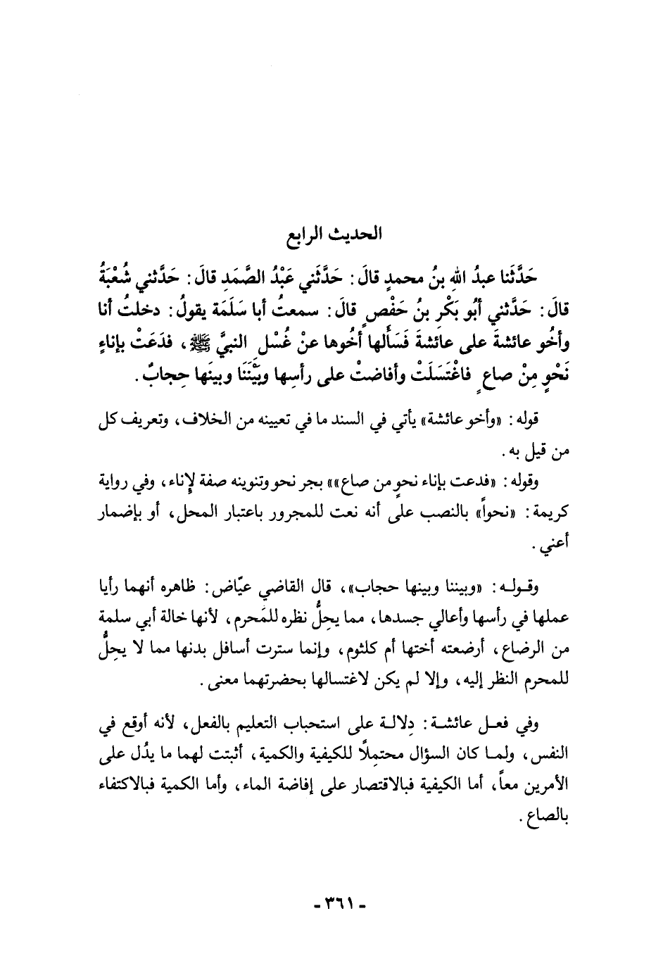 حَدَّثَنَا عَبْدُ اللَّهِ بْنُ مُحَمَّدٍ قَالَ: حَدَّثَنِي عَبْدُ الصَّمَدِ قَالَ: حَدَّثَنِي شُعْبَةُ قَالَ: حَدَّثَنِي أَبُو بَكْرِ بْنُ حَفْصٍ قَالَ: سَمِعْتُ أَبَا سَلَمَةَ يَقُولُ: دَخَلْتُ أَنَا وَأَخُو عَائِشَةَ عَلَى عَائِشَةَ فَسَأَلَهَا أَخُوهَا عَنْ غُسْلِ النَّبِيِّ -صلى الله عليه وسلم- فَدَعَتْ بِإِنَاءٍ نَحْوًا مِنْ صَاعٍ، فَاغْتَسَلَتْ وَأَفَاضَتْ عَلَى رَأْسِهَا، وَبَيْنَنَا وَبَيْنَهَا حِجَابٌ.