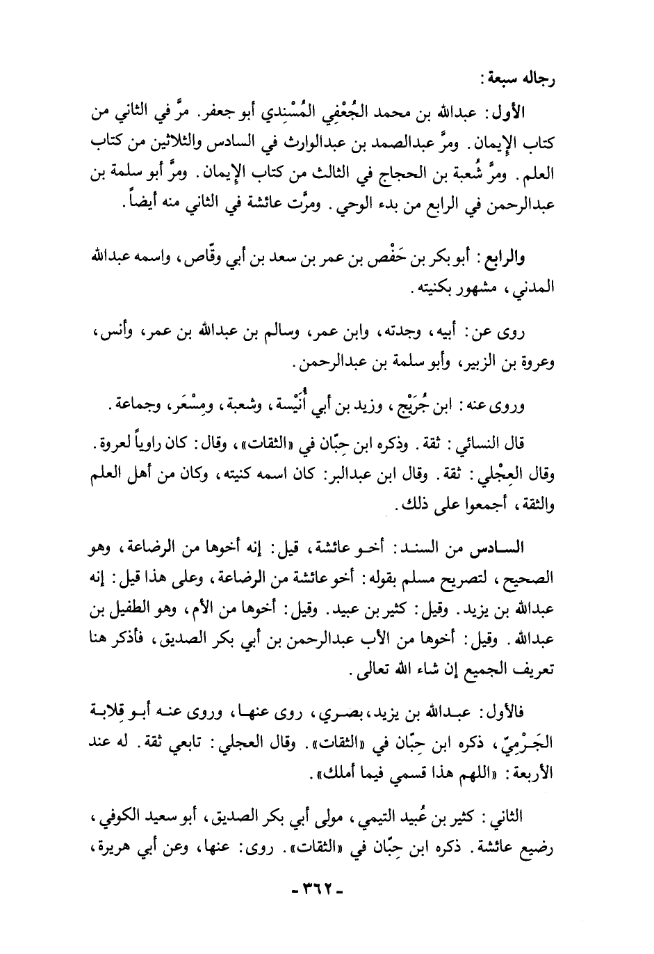 الأول: عبد الله بن محمد الجُعْفِي المُسْنِدي أبو جعفر. مرَّ في الثاني من كتاب الإيمان. ومرَّ عبد الصمد بن عبد الوارث في السادس والثلاثين من كتاب العلم. ومرَّ شُعبة بن الحجاج في الثالث من كتاب الإيمان. ومرَّ أبو سلمة بن عبد الرحمن في الرابع من بدء الوحي. ومرَّت عائشة في الثاني منه أيضًا.