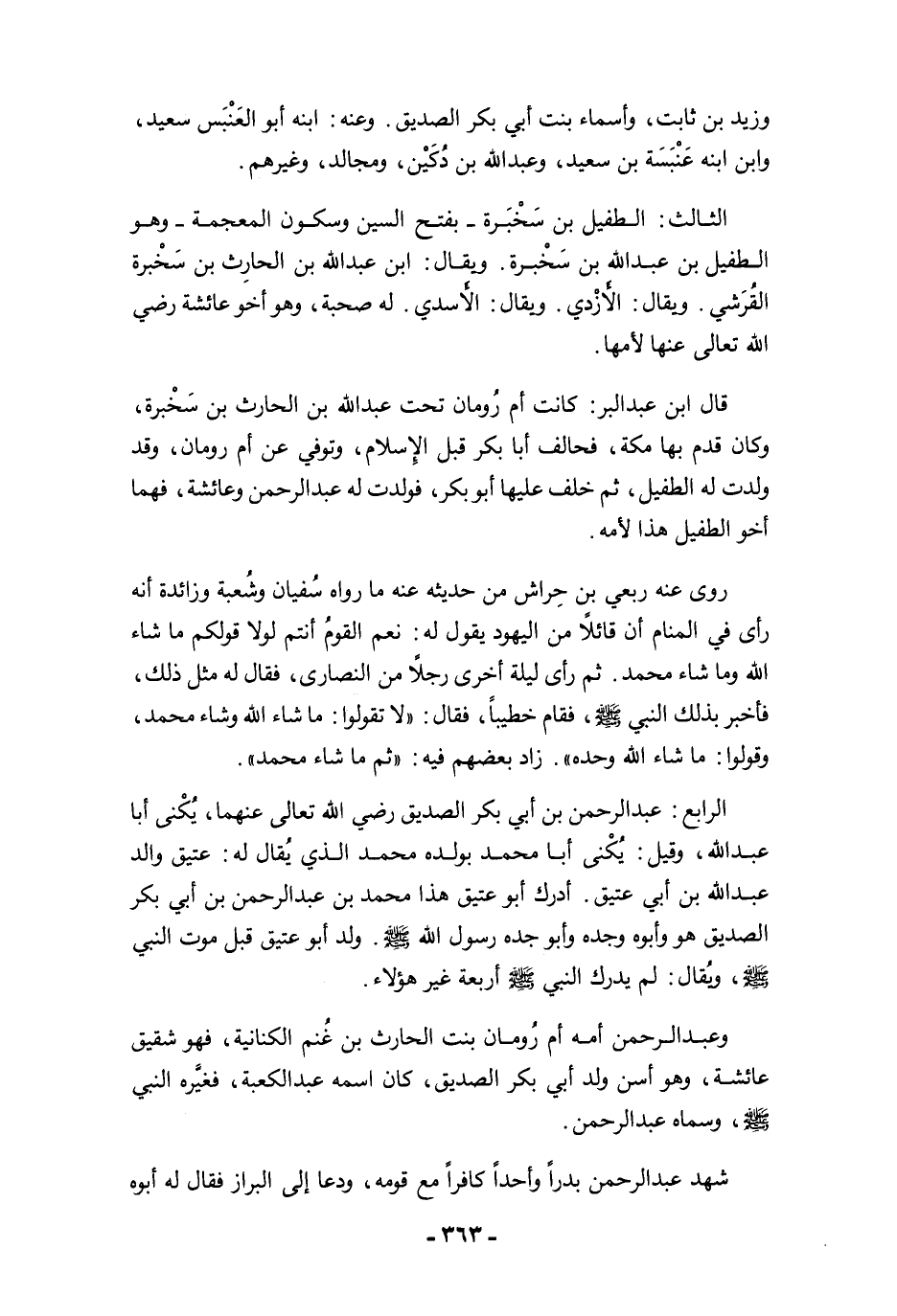 الرابع: عبد الرحمن بن أبي بكر الصديق رضي الله تعالى عنهما، يُكْنى أبا عبد الله، وقيل: يُكْنى أبا محمد بولده محمد الذي يُقال له: عتيق والد عبد الله بن أبي عتيق. أدرك أبو عتيق هذا محمد بن عبد الرحمن بن أبي بكر الصديق هو وأبوه وجده وأبو جده رسول الله -صلى الله عليه وسلم-. ولد أبو عتيق قبل موت النبي -صلى الله عليه وسلم-، ويُقال: لم يدرك النبي -صلى الله عليه وسلم- أربعة غير هؤلاء.