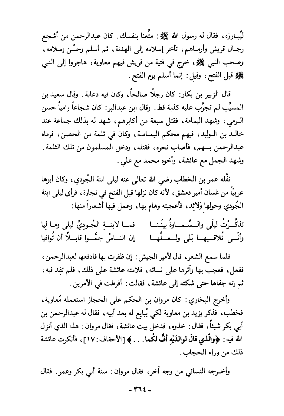 وأخرج البخاري: كان مروان بن الحكم على الحجاز استعمله مُعاوية، فخطب، فذكر يزيد بن معاوية لكي يُبايع له بعد أبيه، فقال له عبد الرحمن بن أبي بكر شيئًا، فقال: خذوه، فدخل بيت عائشة، فقال مروان: هذا الذي أنزل الله فيه: {وَالَّذِي قَالَ لِوَالِدَيْهِ أُفٍّ لَكُمَا ...} [الأحقاف: 17]، فأنكرت عائشة ذلك من وراء الحجاب.