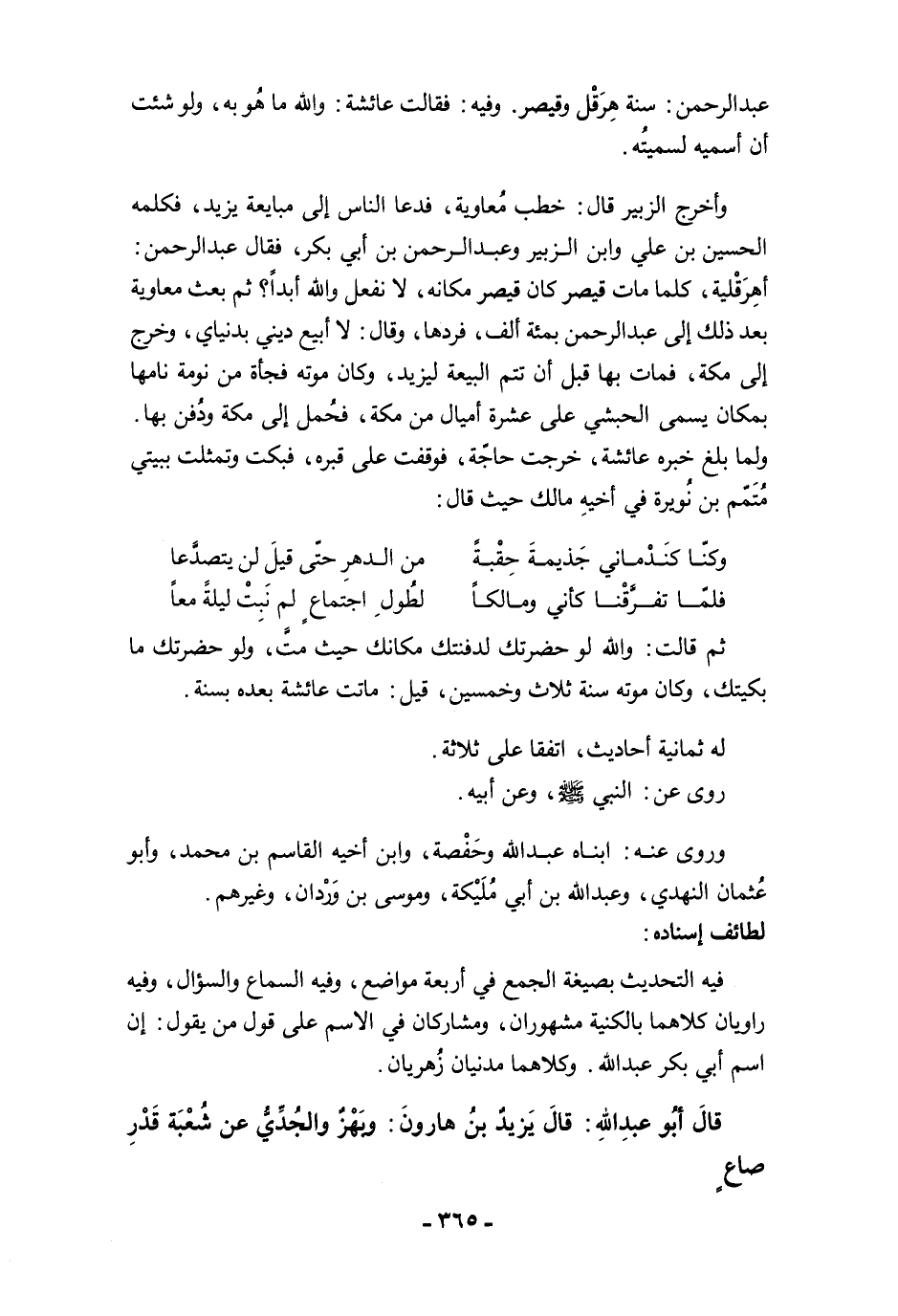 وأخرج الزبير قال: خطب مُعاوية، فدعا الناس إلى مبايعة يزيد، فكلمه الحسين بن علي وابن الزبير وعبد الرحمن بن أبي بكر، فقال عبد الرحمن: أهِرَقْلية، كلما مات قيصر كان قيصر مكانه، لا نفعل والله أبدًا؟ ثم بعث معاوية بعد ذلك إلى عبد الرحمن بمئة ألف، فردها، وقال: لا أبيع ديني بدنياي، وخرج إلى مكة، فمات بها قبل أن تتم البيعة ليزيد، وكان موته فجأة من نومة نامها بمكان يسمى الحبشي على عشرة أميال من مكة، فحُمل إلى مكة ودُفن بها. ولما بلغ خبره عائشة، خرجت حاجّة، فوقفت على قبره، فبكت وتمثلت ببيتي مُتَمّم بن نُويرة في أخيهِ مالك حيث قال: