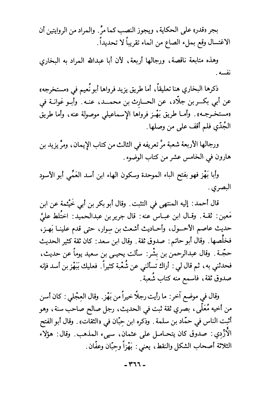 وقال في موضع آخر: ما رأيت رجلًا خيرًا من بَهْز. وقال العِجْلي: كان أسن من أخيه مُعَلّى، بصري ثقة ثبت في الحديث، رجل صالح صاحب سنة، وهو أثبت الناس في حمّاد بن سلمة. وذكره ابن حِبّان في "الثقات". وقال أبو الفتح الأَزْدِي: صدوق كان يتحامل على عثمان، سيىء المذهب. وقال: هؤلاء الثلاثة أصحاب الشكل والنقط، يعني: بَهْزًا وحِبّان وعفّان.