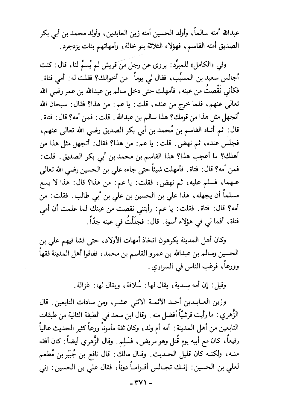 وفي "الكامل" للمبرِّد: يروى عن رجل من قريش لم يُسمَّ لنا، قال: كنت أجالس سعيد بن المسيِّب، فقال لي يومًا: من أخوالك؟ فقلت له: أمي فتاة. فكأني نَقْصتُ من عينه، فأمهلت حتى دخل سالم بن عبد الله بن عمر رضي الله تعالى عنهم، فلما خرج من عنده، قلت: يا عم: من هذا؟ فقال: سبحان الله أتجهل مثل هذا من قومك؟ هذا سالم بن عبد الله. قلت: فمن أمه؟ قال: فتاة. قال: ثم أتاه القاسم بن مُحمد بن أبي بكر الصديق رضي الله تعالى عنهم، فجلس عنده، ثم نهض. قلت: يا عم: من هذا؟ فقال: أتجهل مثل هذا من أهلك؟ ما أعجب هذا؟ هذا القاسم بن محمد بن أبي بكر الصديق. قلت: فمن أمه؟ قال: فتاة. فأمهلت شيئاً حتى جاءه علي بن الحسين رضي الله تعالى عنهما، فسلم عليه، ثم نهض، فقلت: يا عم: من هذا؟ قال: هذا لا يسع مسلمًا أن يجهله، هذا علي بن الحسين بن علي بن أبي طالب. فقلت: من أمه؟ قال: فتاة. فقلت: يا عم: رأيتني نقصت من عينك لما علمت أن أمي فتاة، أفما لي في هؤلاء أسوة. قال: فجلَلْتُ في عينه جدًّا.