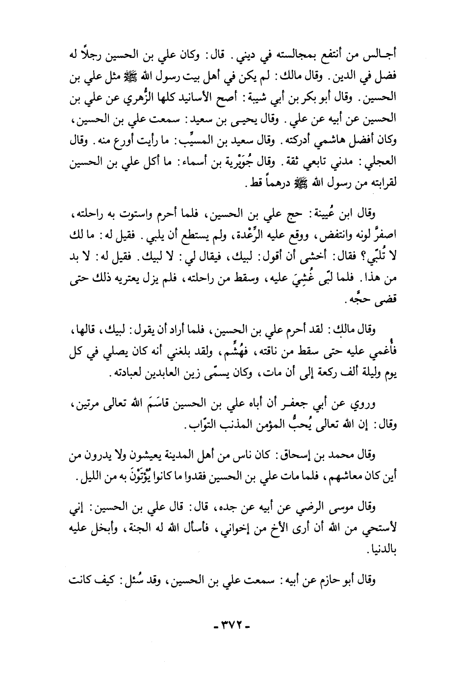 وقال مالك: لقد أحرم علي بن الحسين، فلما أراد أن يقول: لبيك، قالها، فأُغمي عليه حتى سقط من ناقته، فهُشم، ولقد بلغني أنه كان يصلي في كل يوم وليلة ألف ركعة إلى أن مات، وكان يسمّى زين العابدين لعبادته.