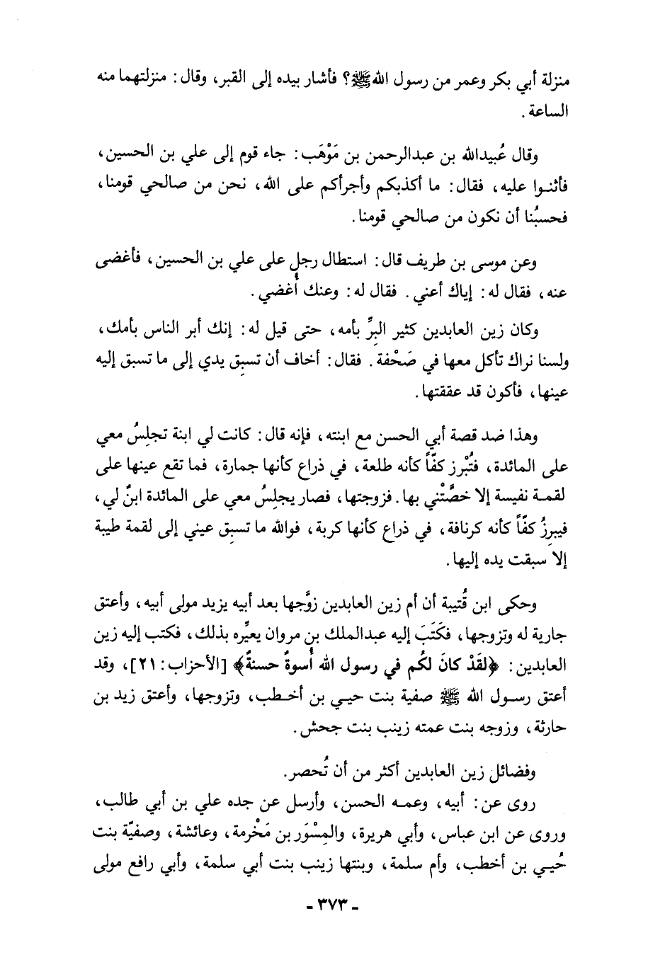 وحكى ابن قُتيبة أن أم زين العابدين زوَّجها بعد أبيه يزيد مولى أبيه، وأعتق جارية له وتزوجها، فكَتَبَ إليه عبد الملك بن مروان يعيِّره بذلك، فكتب إليه زين العابدين: {لَقَدْ كَانَ لَكُمْ فِي رَسُولِ اللَّهِ أُسْوَةٌ حَسَنَةٌ} [الأحزاب: 21]، وقد أعتق رسول الله -صلى الله عليه وسلم- صفية بنت حيي بن أخطب، وتزوجها، وأعتق زيد بن حارثة، وزوجه بنت عمته زينب بنت جحش.